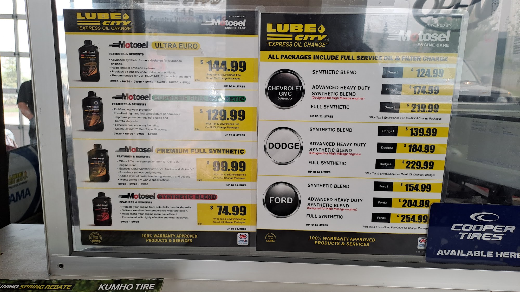 Quick oil and filter change at very reasonable rates. I also learned from the mechanic how to check the oil level and how easy it is to replace the filter if I wanted to do it myself. Thanks Lube City!