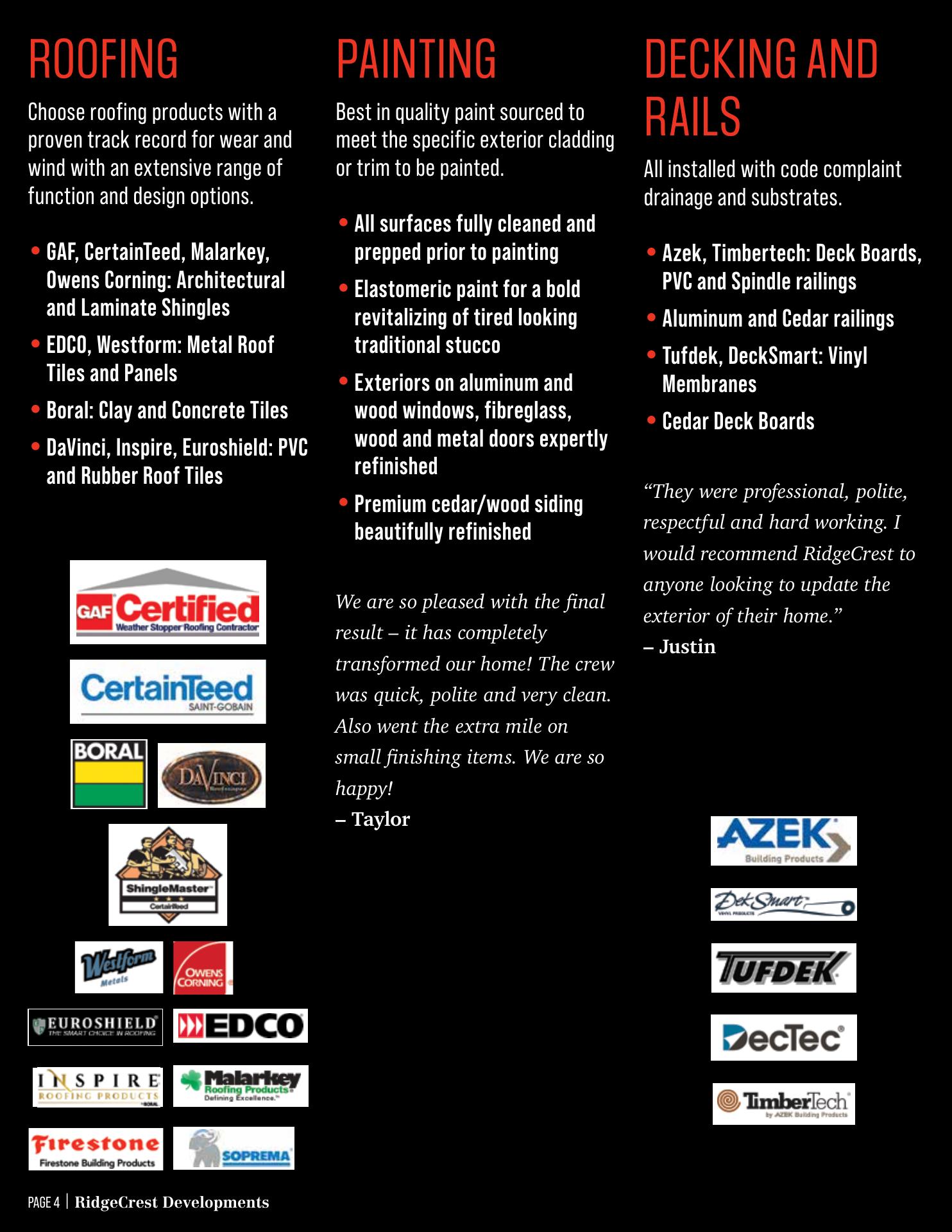 We interviewed several companies before we selected RidgeCrest Developments to upgrade our exterior of our house. The main objective was to repair the damage we are seeing in our stucco and to prevent any future damages. Plus we wanted make some upgrades to enhance the look of our house. We worked closely with David Marrelli (President/owner) to define the scope of all the work.
