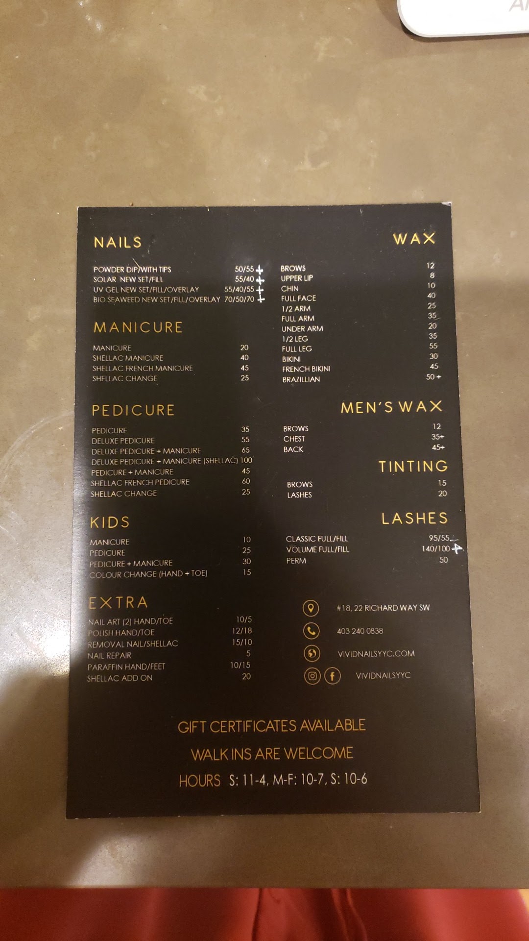 This is a fantastic gem of a salon. I recently moved back to Calgary and encountered a few duds in quality or service, but Vivid Nails has consistently offered excellent service and beautiful results at a great price. I cannot recommend them enough!!!!