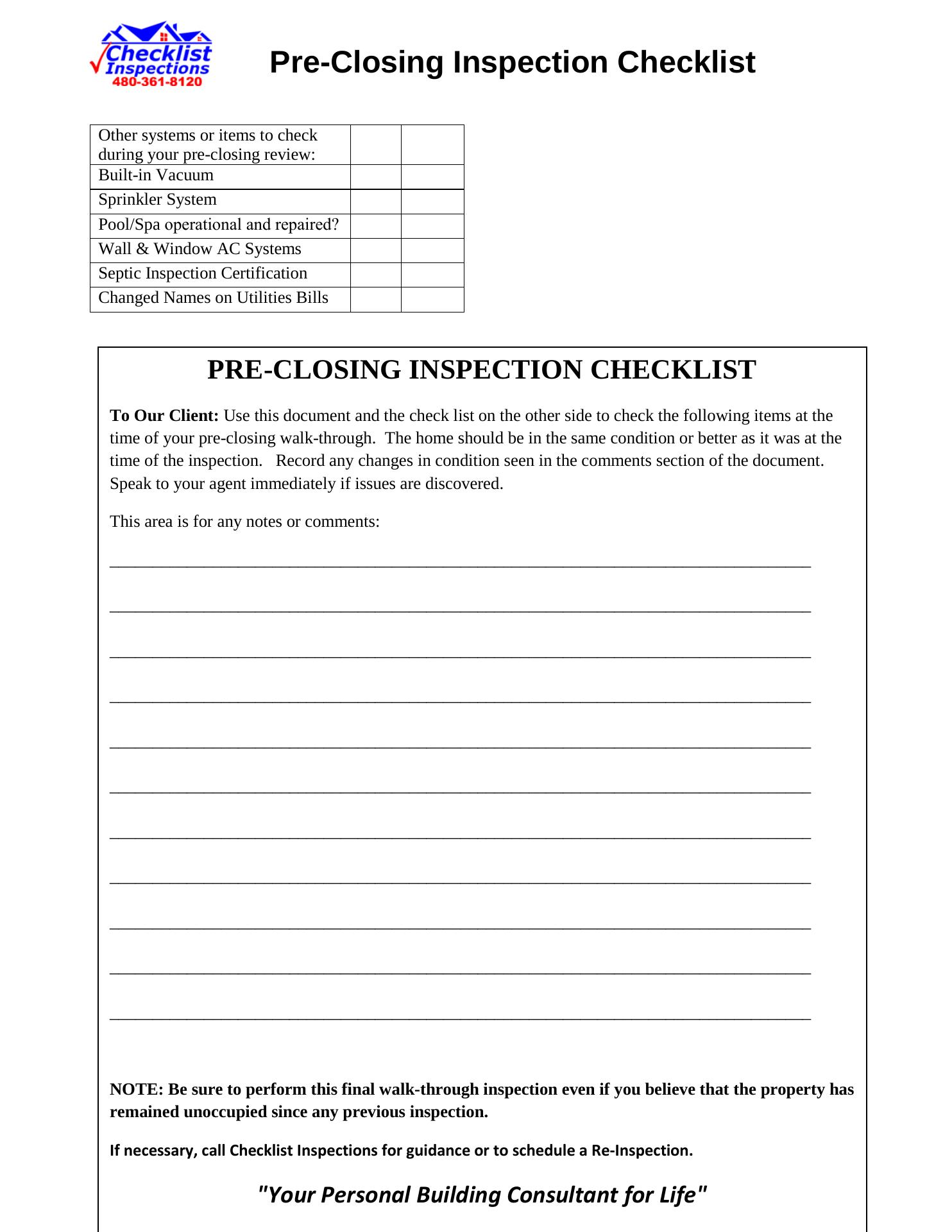Checklist Inspctions did a fabulous job with my new home. Brian was very thorough and timely. Inspection was scheduled immediately and no stone was left unturned. He then discussed and pointed out every item he found faulty on the list. His report was thorough and immediate. There isn’t much to repair but little problems left unattended can blossom into big problems I’m happy to know I’ll be moving into a home that is safe. Excellent work by Brian. Thank you Checklist for employing caring and knowledgeable people. Not an inexpensive endeavor but very well worth every penny.