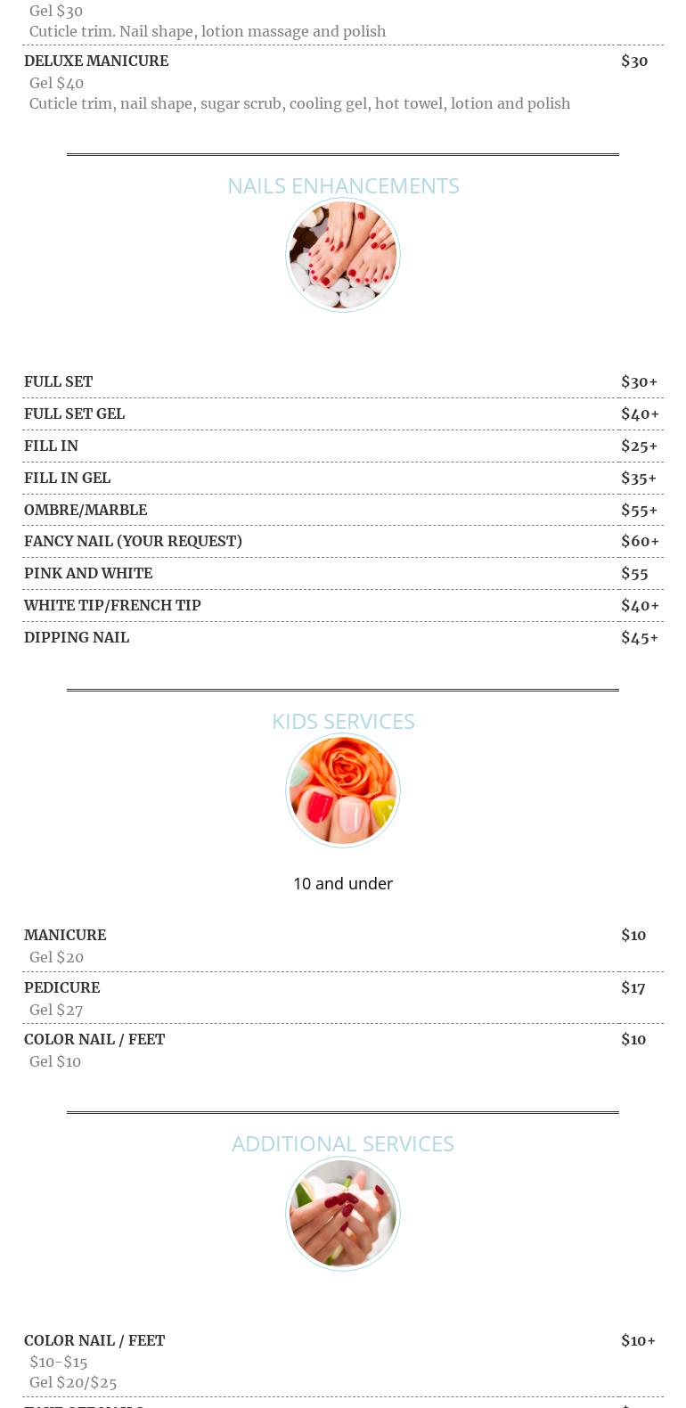 They did a great job on my pedicure. My first time here. I got the basic and I got a salt scrub, and hot towel with the massage. She fixed two nails, one that broke and one that the nail polish chipped off at no charge. Can't beat that.