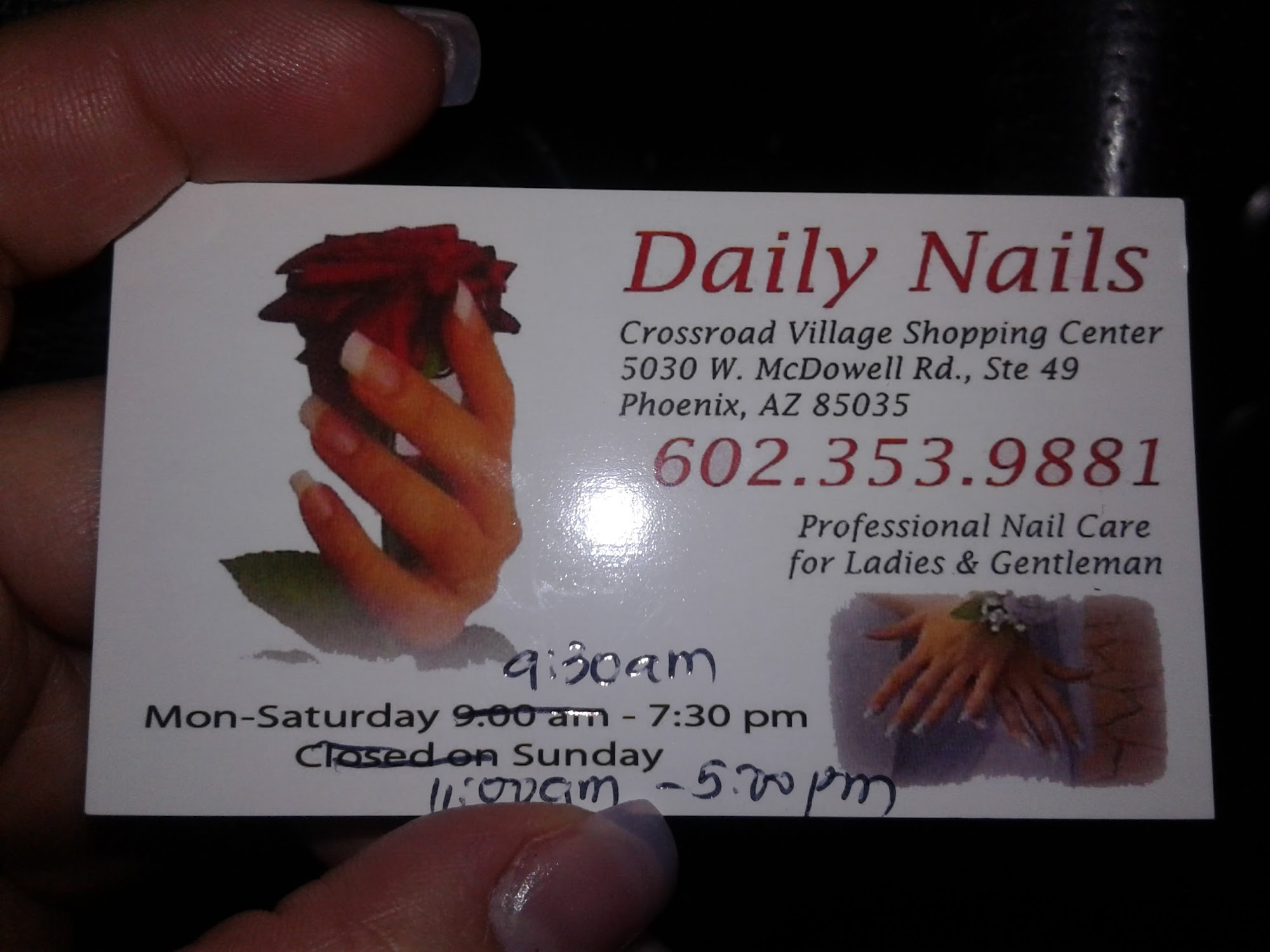 I got there at 510pm on a Sunday and they were nice enough to do my nails even though they were closed. For some reason their hours were wrong on Google and clients kept arriving but they were all declined. Before leaving they gave me a card which clearly states their hours and I already suggested the change. Mon-Sat 9:30am 8pm Sun 11am-5pm