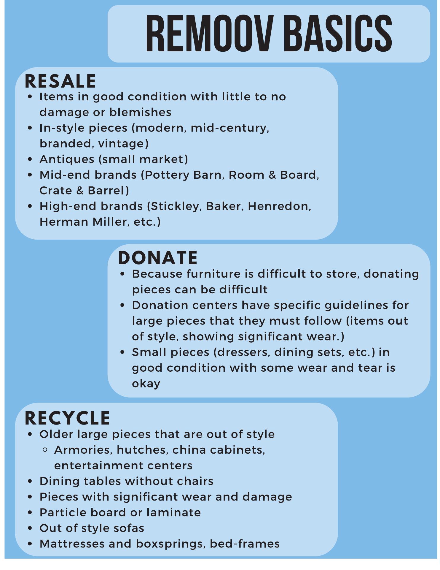 This is an 18-month look-back at my experience with Remoov. In January 2022, we sold our Phoenix house and moved to Michigan (yes, really). Remoov promptly collected our truckload of stuff and posted it for resale per our agreement; I was pleased with the prices they assigned.About half sold promptly and my account was credited accordingly. The rest went slower (rugs, pictures, misc. furniture pieces, etc.). Remoov sent me monthly email reminders to check my account for updates and status, which were very thorough and detailed.After several months there were still some items unsold. They offered me the option on each item to steeply reduce the price (usually by half)... read full review