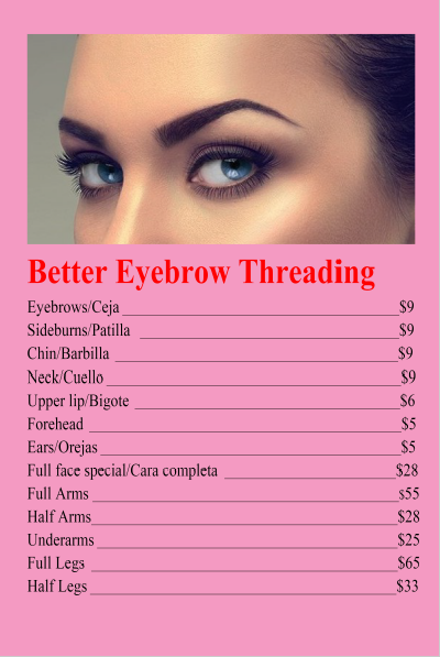 Best place to get your brows threaded. The owner is so gentle and quick. I don't have to tell her a shape, she just cleans them up. I love that she does witch hazel at the end.