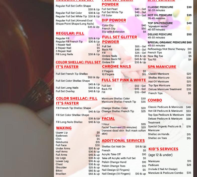 I usually don't leave reviews but felt compelled to for this one. I walked in without an appointment as I'm not from the area but was just looking for a place to get a set of acrylics. The ladies here are so lovely and very knowledgable and recommended the best color for me. Thank you so much and I would recommend Top Spa Nails