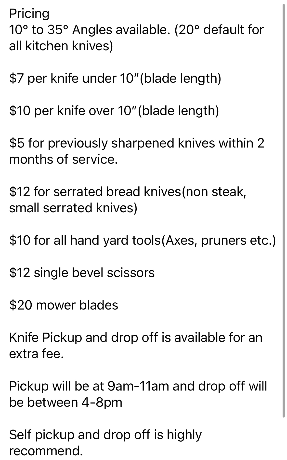 Shawn answered all my questions quickly. I was able to take him 10 knives to sharpen for me. Carbon steel, Damascus steel and stainless. Shawn was versed in the different angles for the different makers and BOY HOWDY, did he put an edge on them!!!