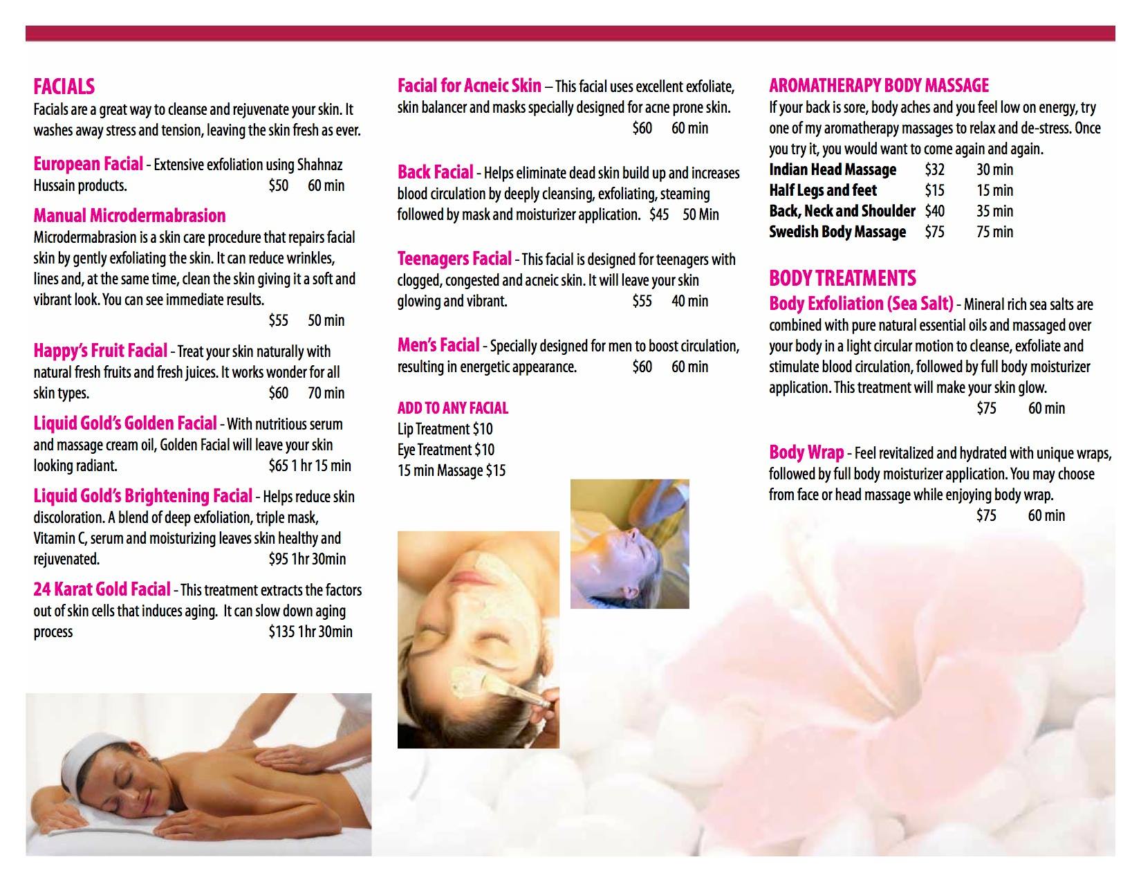 Bought my girlfriend a Christmas special gift certificate for a facial and a shoulder/back massage. My girlfriend absolutely loved this place! Only reason I know is that it's her fav place, guys def send your girl here. Can't go wrong. Happy was so accommodating. Little hard getting hold of her but that's because she's so busy. Txt txt txt