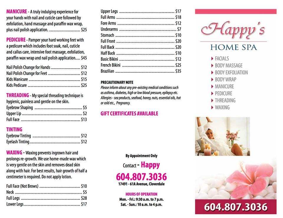 I would highly recommend this beautiful home spa! Happy is amazing at what she does. Love her facials. She truly knows what she is doing. She never rushes the appointment. She takes her time and truly gives you a relaxing service. I have been to many facials and none of them compare to hers. I always leave with such a glow to my skin. And my skin looks and feels amazing.