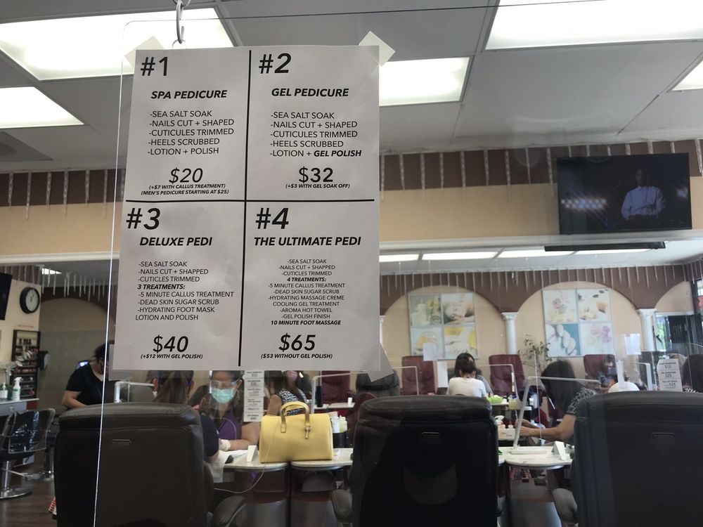 Wife recommended; husband approved! First time here and had a good experience. I arrived for my pedicure appointment with Christine, and was seated within 5 minutes. They keep the salon very clean, and have Plexiglass shields between the customers and pedicurists. The chairs are comfortable, with a nice back massage feature. It's a large place, so they can handle quite a few customers. There are five different Pedi packages to choose from (see my photo). I went with the "Royal Pedi" for $99, which comes with a 25 minute foot/leg massage. Since I didn't get the Gel Polish finish, I was offered an additional 10 minutes of massage, or a price reduction... read full review