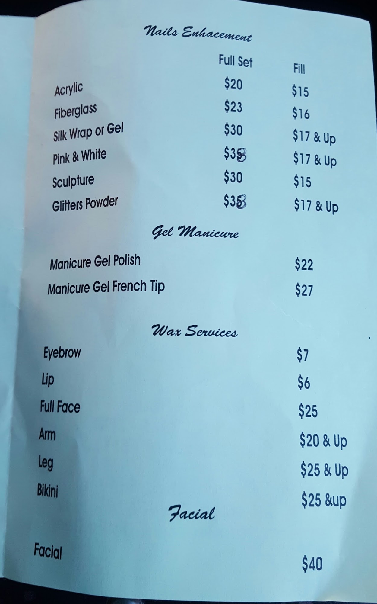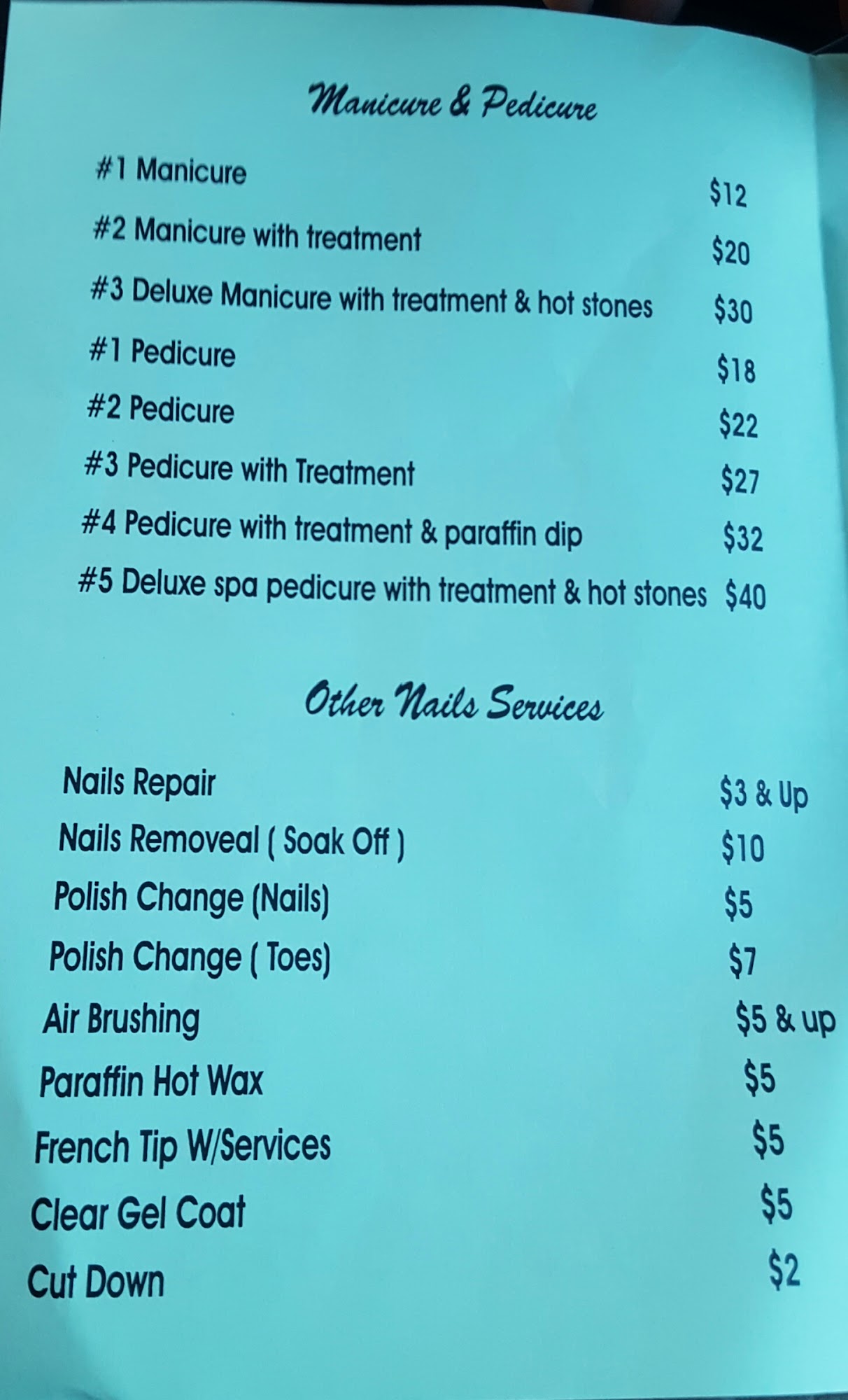 Great service! Love it here. I took my mom and she said she love it as well and will definitely come back! I got dipped manicure came out to $40, no design and #3 pedicure that was $40 as well comes with the paraffin wax and a 10-15 min massage. Love it! Cant wait to come back!