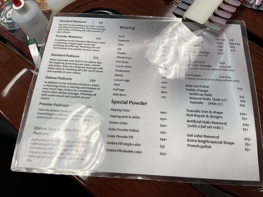 I tagged along with my sister in law to this nail shop. It was a nice quiet vibe. Came in on a Friday morning, not busy at all. I was take care of by Tina. She was great. Very friendly, and made my nail shape nice. I wanted it cute and short today. She took her time doing my nails. I am very happy with this place. I will come back :)