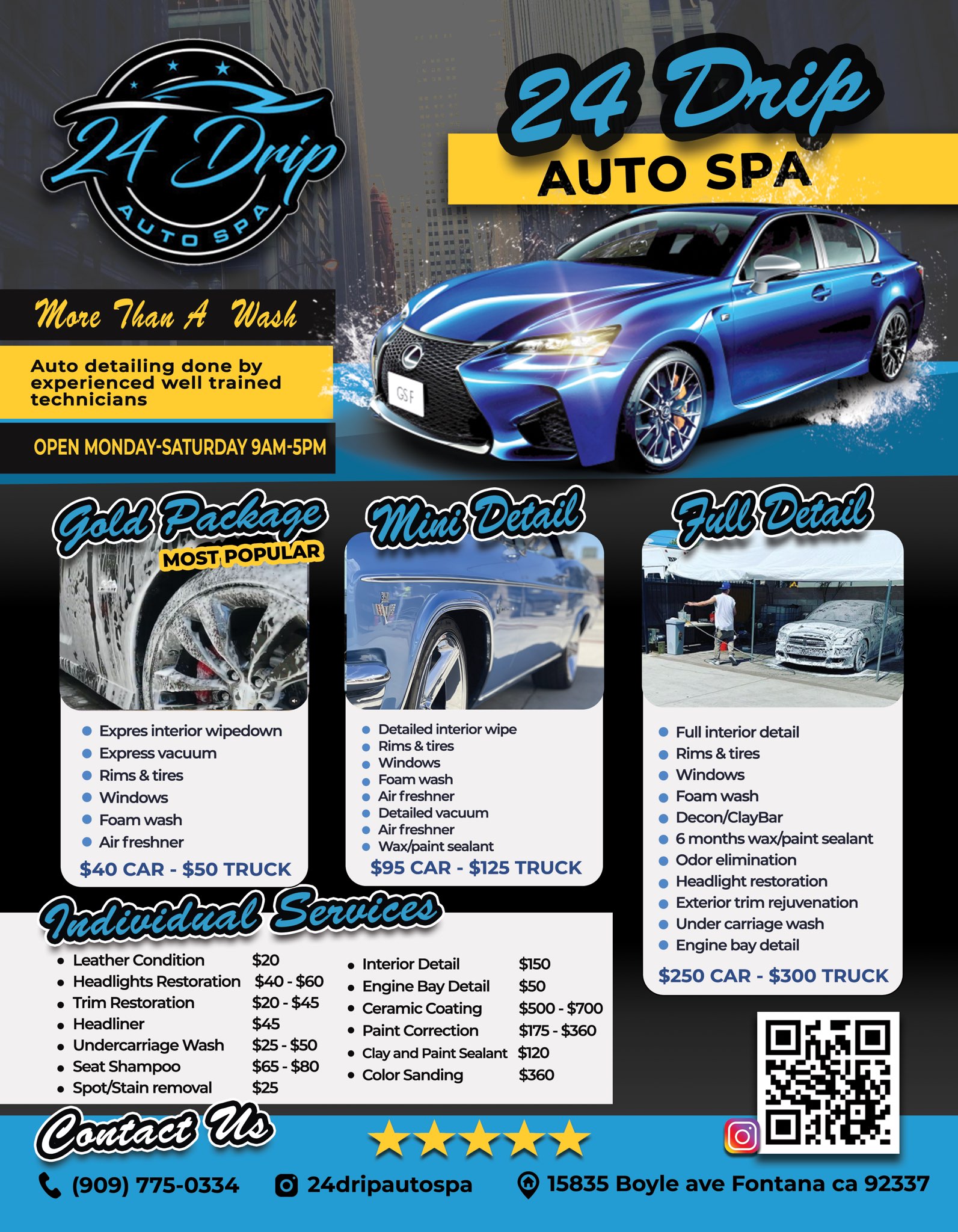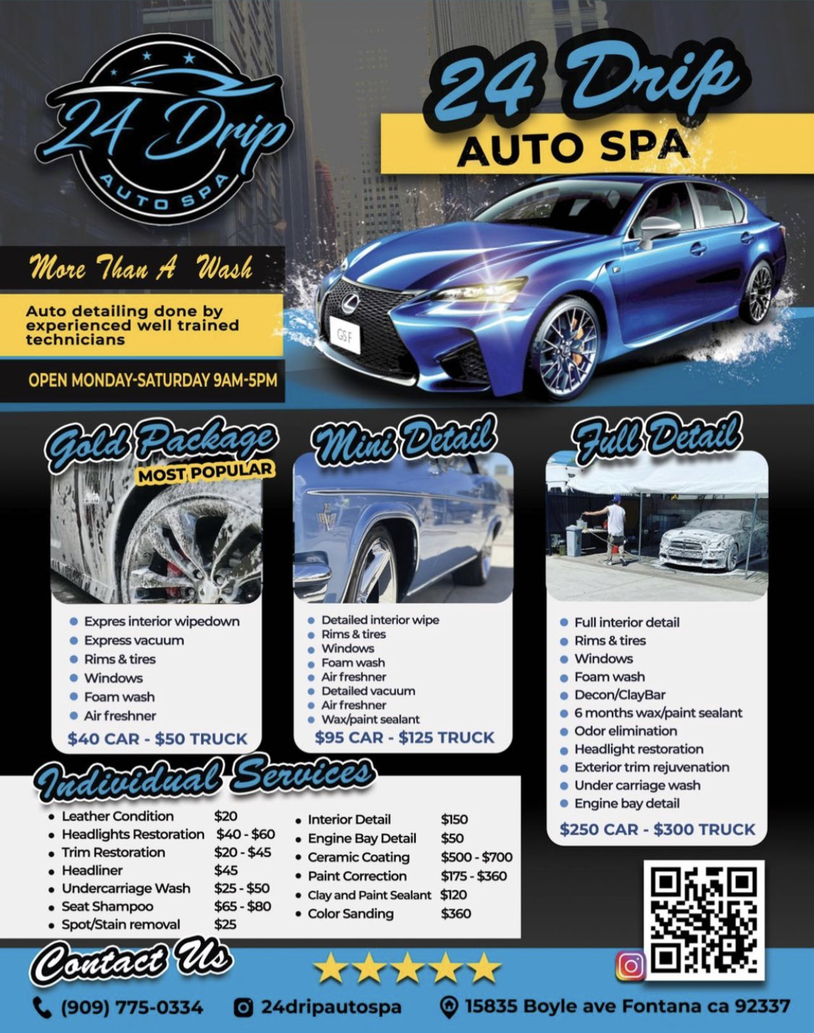 Like mentioned in the bio 24 drip auto spa is more than a wash I was able to take a vantage of their full amenities offered at their location and got a haircut and a workout in while my vehicle was getting detailed!! Overall great experience great customer service and clean facilities I highly recommendServices: Auto detailing