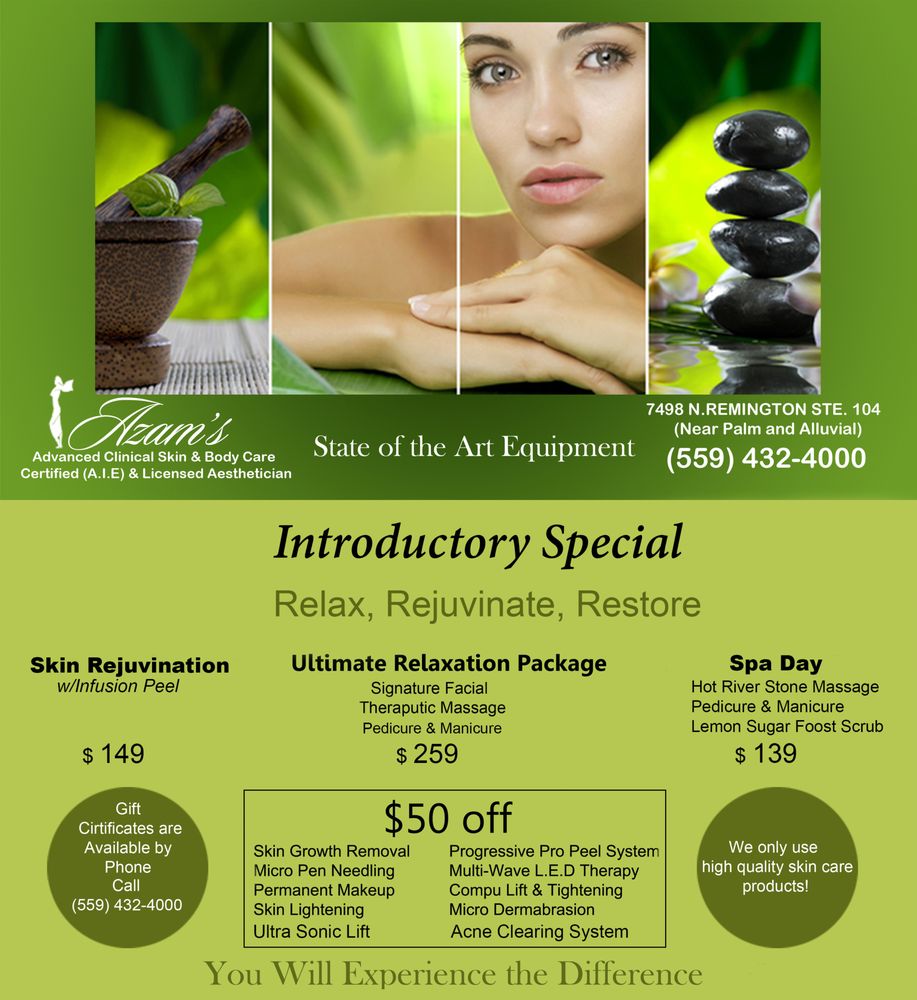 I've been going to Azam for about 20 years. I have an eyebrow wax and face wax every 4-6 weeks. Her products are beyond excellent. I am 61 years old and there are no wrinkles on my face.