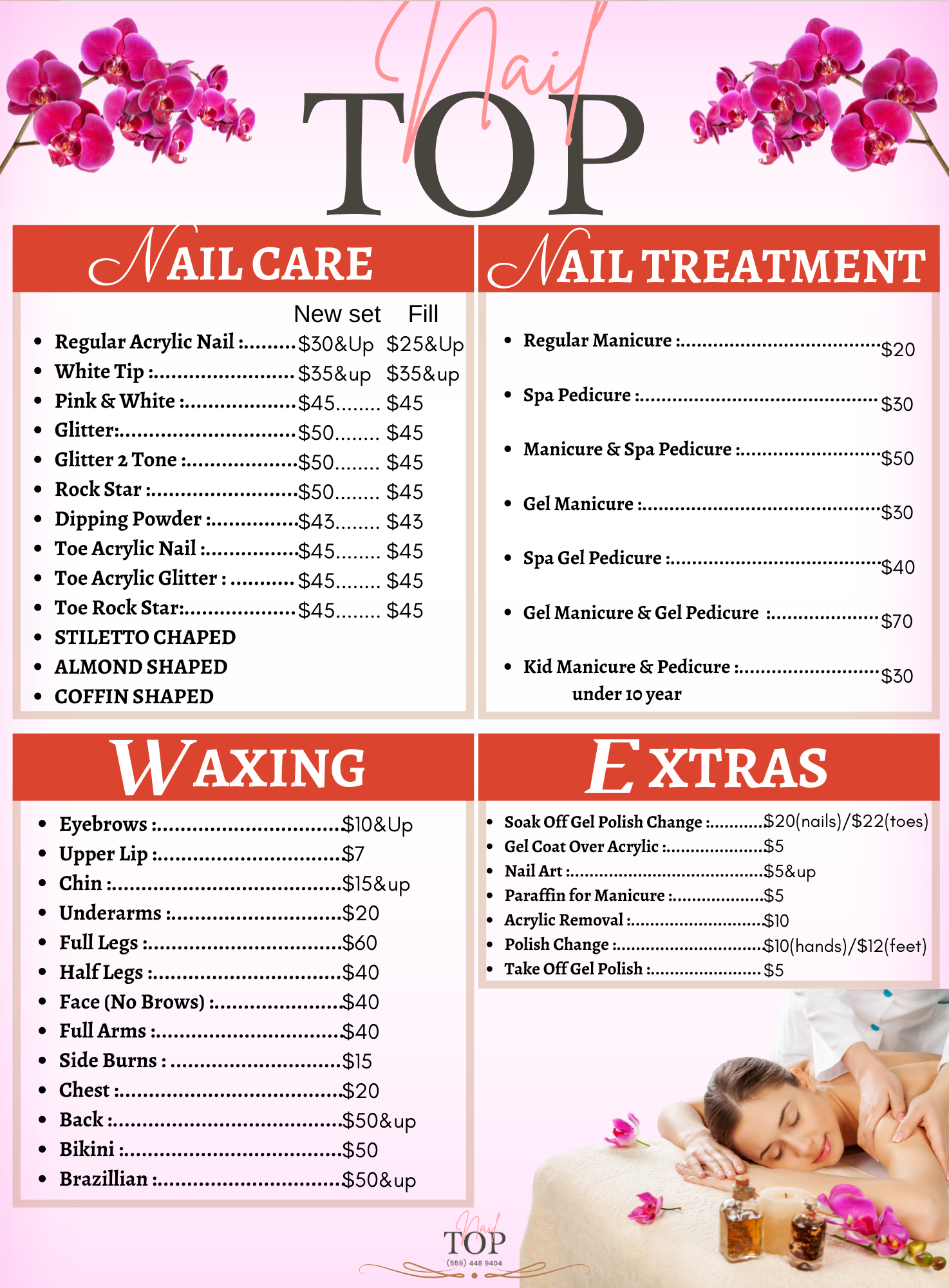 Thank you to Top Nails for the amazing nail designs. The team helped me pick out the perfect colors for my design and executed the gel-X nails with great skill. The service was attentive and professional, ensuring that I was satisfied with the result. If you’re seeking unique and beautiful nail designs, Top Nails is definitely worth a visit!