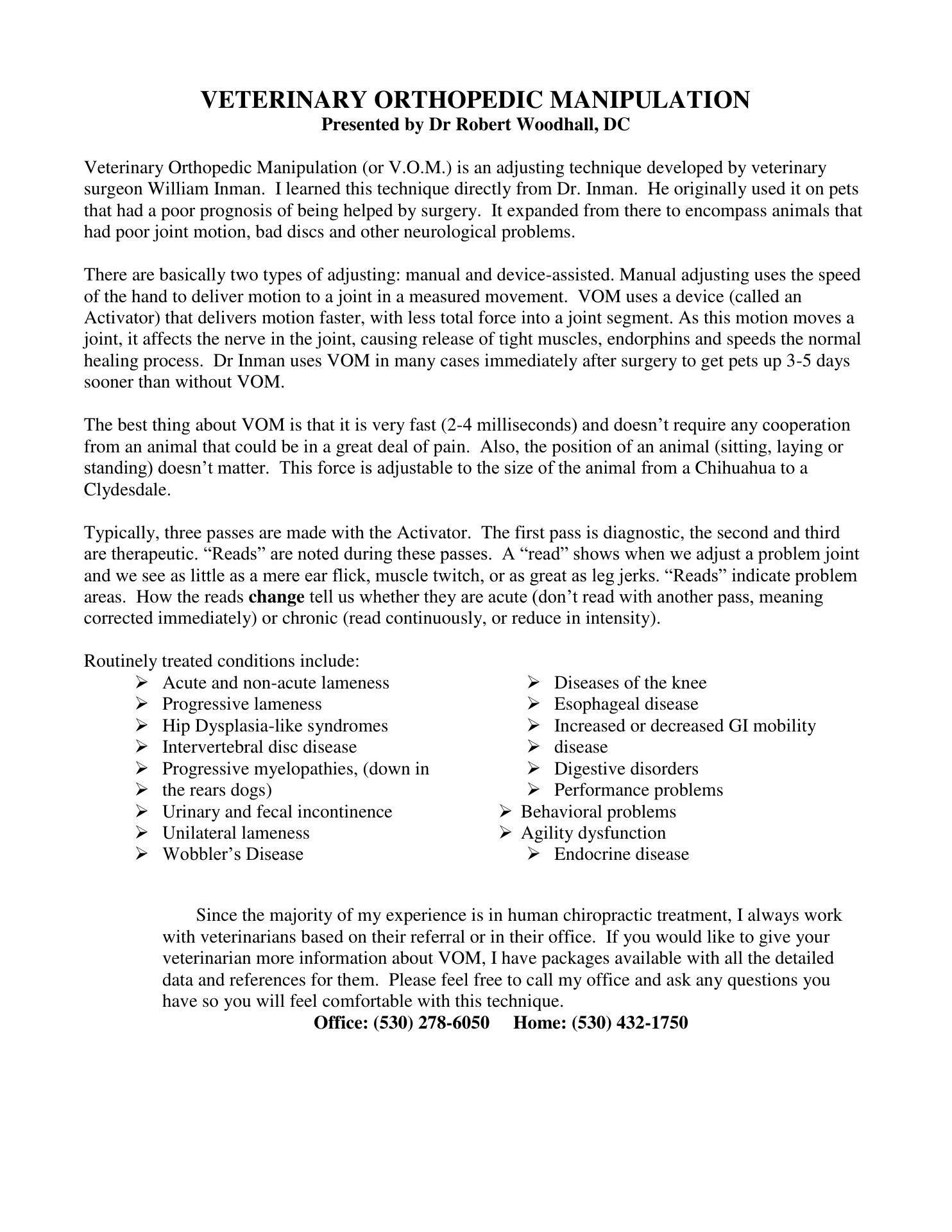 Don't know what our family would do without Dr. Woodhall! He has helped us all! He is attentive and thorough. My dog was diagnosed to be on tramadol and head pressing against a wall, unable to move. After one visit, she was walking again and well on her way to a better life. Not to mention that Dr. Woodhall is a wise and knowledgeable person that is so enjoyable to be around, that we all want to go! Every visit we learn something new, just an added bonus to an adjustment!