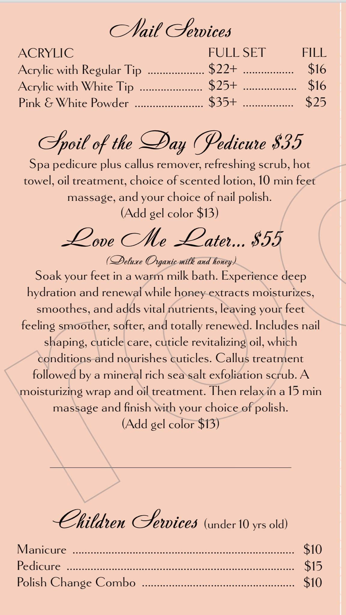 Love my nails! Nail tech as patient with me as I couldn't decide on a color. Peaceful ambiance. Sweet lady did my pedicure was gentle and relaxing. Definitely coming back. New favorite spot!