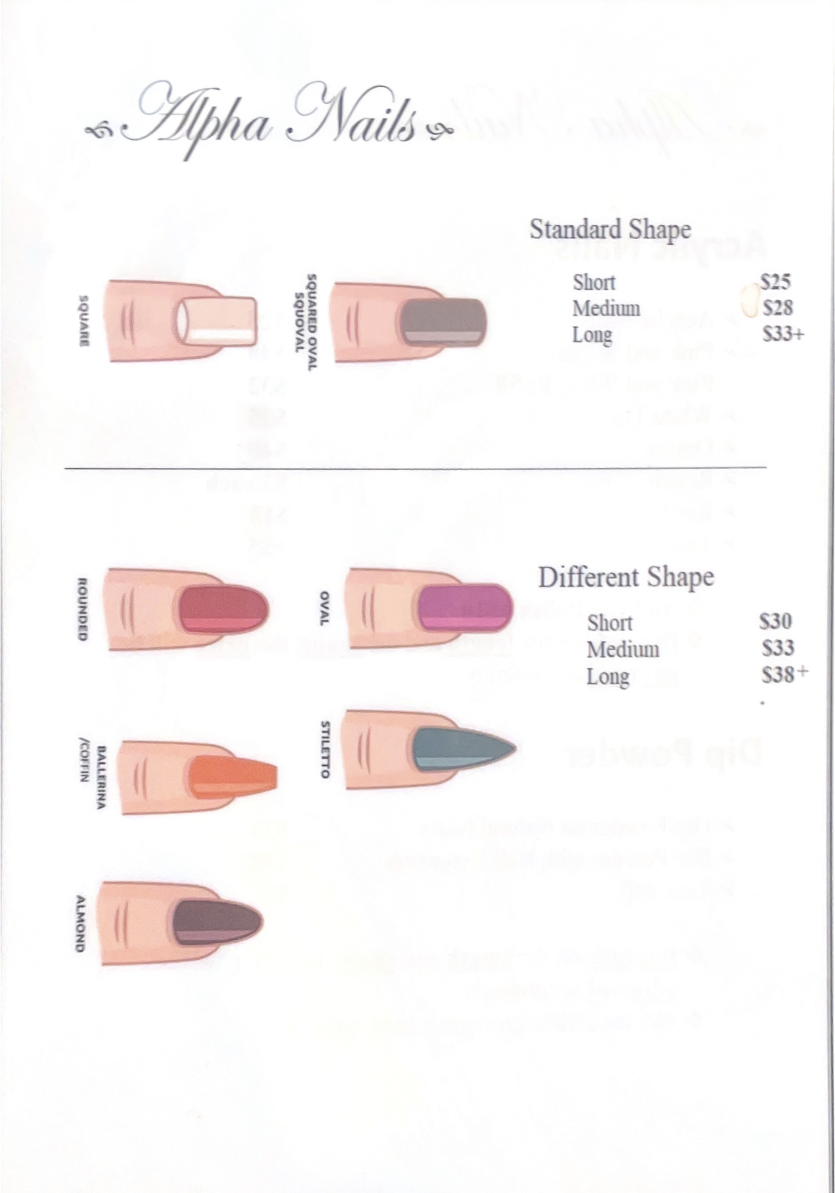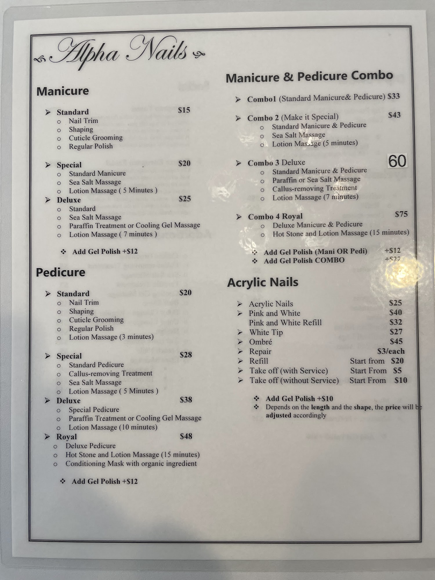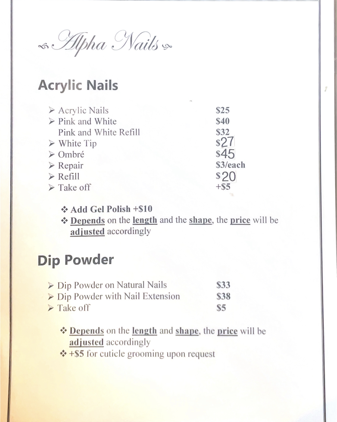 Alpha Nails always does the best job consistently for my gel manicure and regular pedicure. Very kind owners and always welcoming. Thank you !