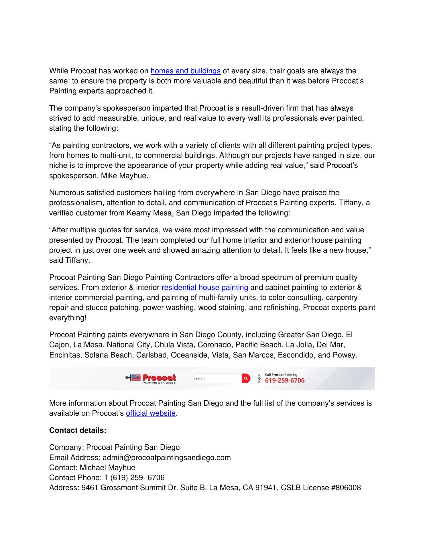 I highly recommend Procoat Painting San Diego for any Painting needs. I live and work in East county San Diego and have had them out for estimates and projects for my property management company. There estimates are very clear and they have always stood by their word and their work. The painters Jose, Ty and Juan have been so professional courteous and clean. We had some problems with tenants but the Project Manager Michael handled the situation very well and got resolved quickly.
