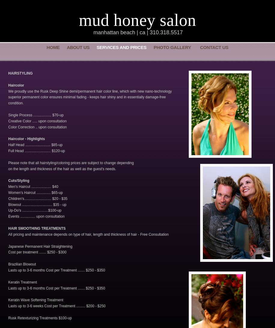 I LOVE Mud Honey Salon! The owner, Branka, is wonderful with Coloring and Hair cutting and makes her clients feel welcome and comfortable. Her prices are very fair. I recommend Mud Honey Salon HIGHLY!!! Joyce Greenleaf