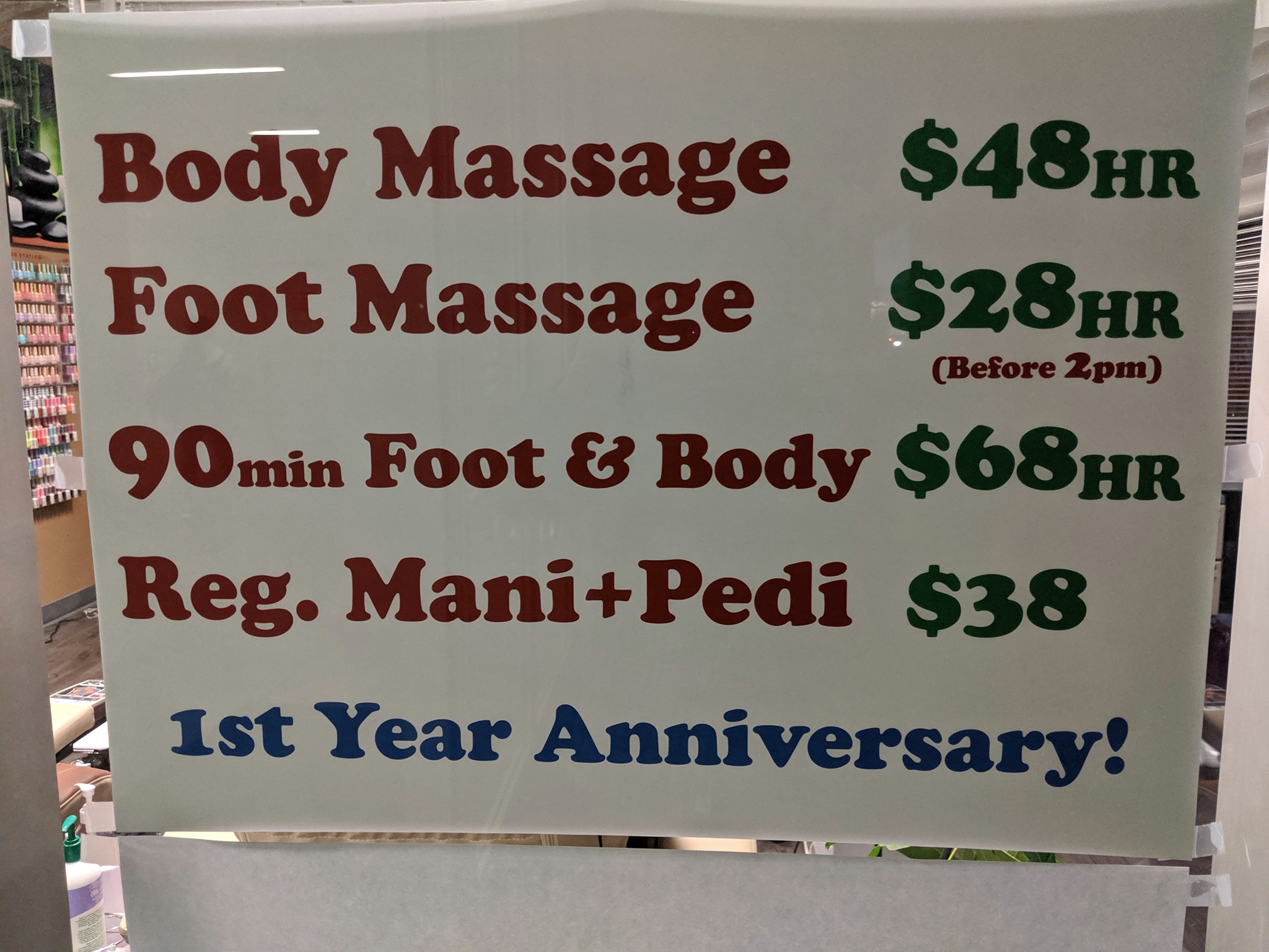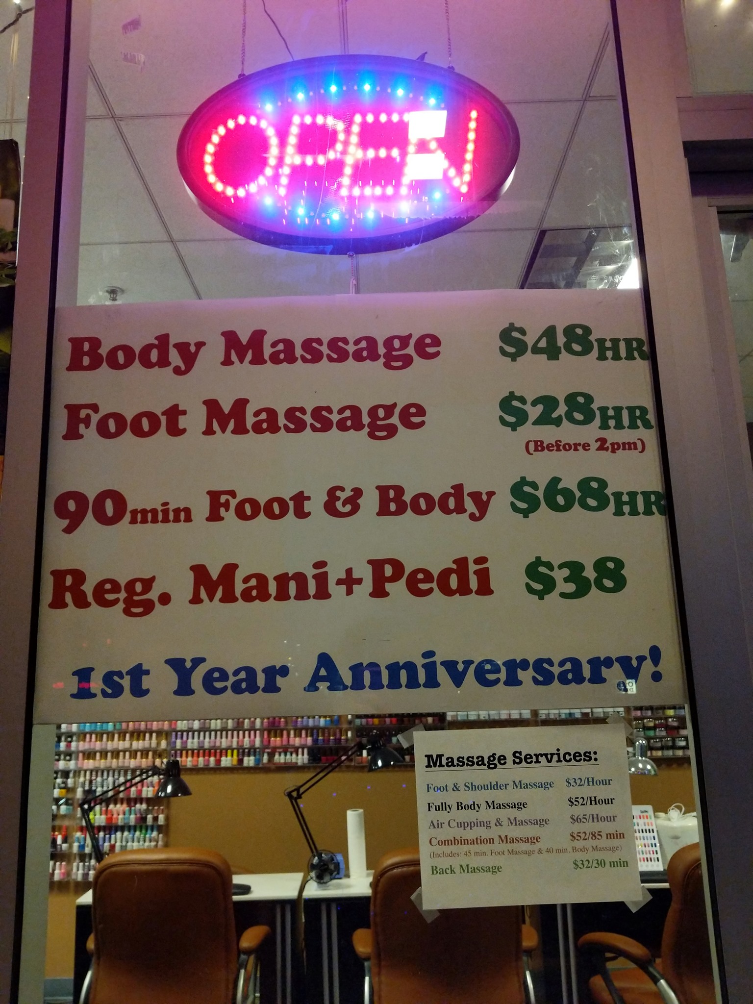 I just had a gel pedicure and a massage here and both were AMAZING!!! I recommend making an appointment because the nail area only has a few chairs but I walked in with my best friend and we just happened to get insanely lucky. I never try new nail places but I was visiting SF and decided to take a chance on my last day here. It was so worth it! Amazing service, the pedi and the massage were so relaxing. Super reasonable prices, very kind and hardworking staff. 10/10 would recommend and I will return next time I’m in town.