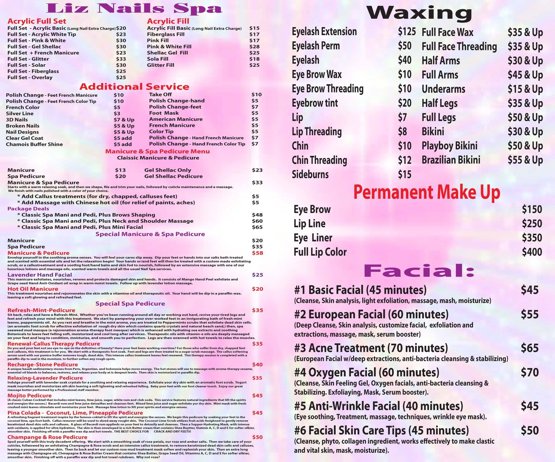 This is my new favorite local spa for acrylic nails ! I normally walk in, any random weekday, and immediately greeted by Liz. Shes friendly and services me quickly and accurately. I have simple taste but she always recommends me cute trends or adds sparkle gems to give me a fire look. Im always satisfied, they do not chip off for the entire 2 - 3 weeks before a fill in or a removal. Thrilled to never have to pay more than 100$ for my full set manicure. I will always return to this spa. *** (( Located only a few blocks from home, its perfect walking distance to groceries & convenient shopping plaza. )) ***