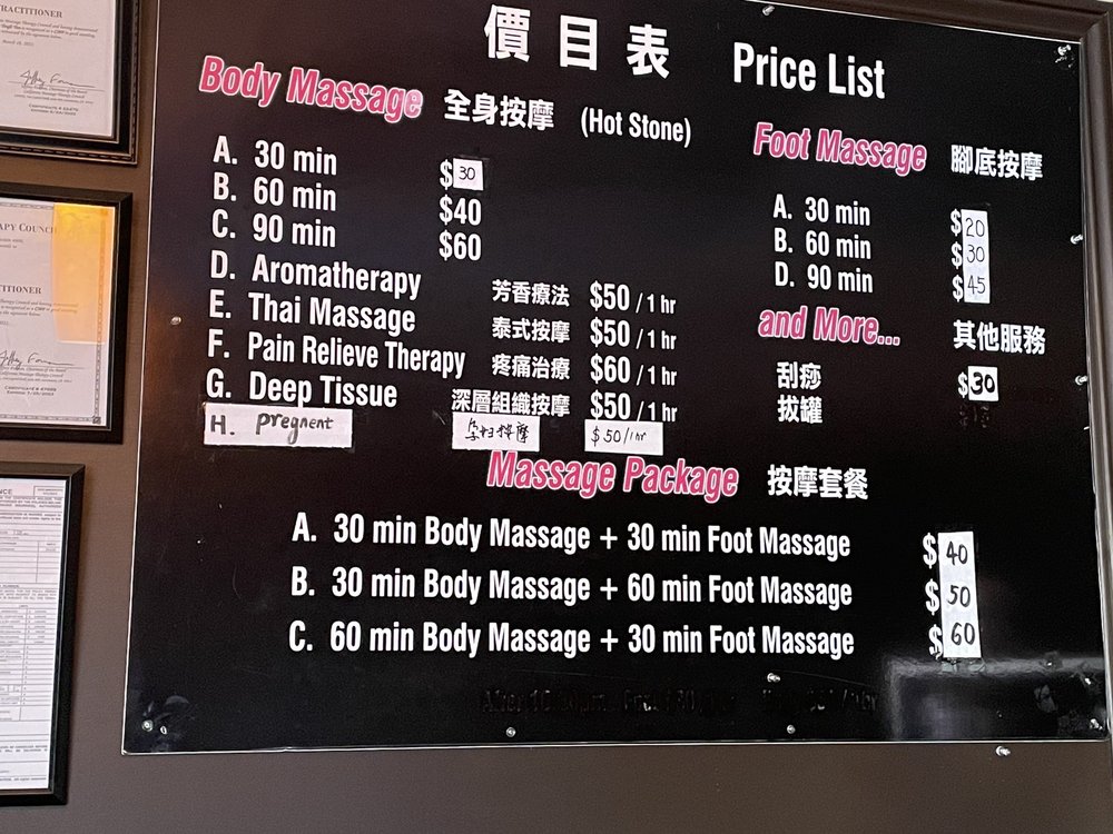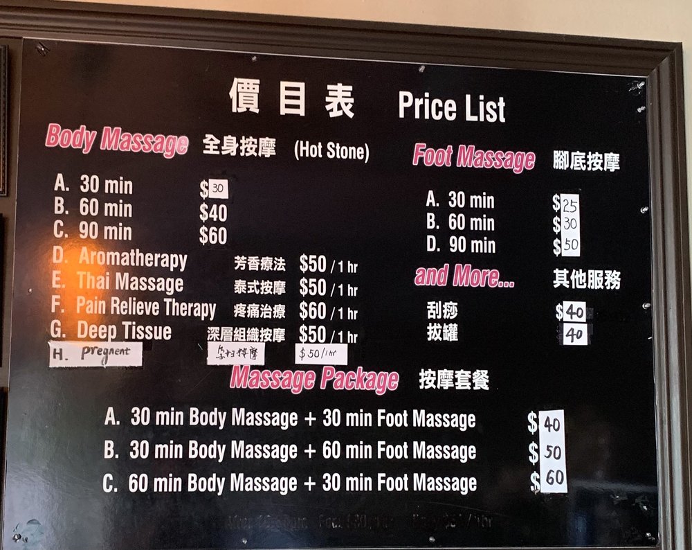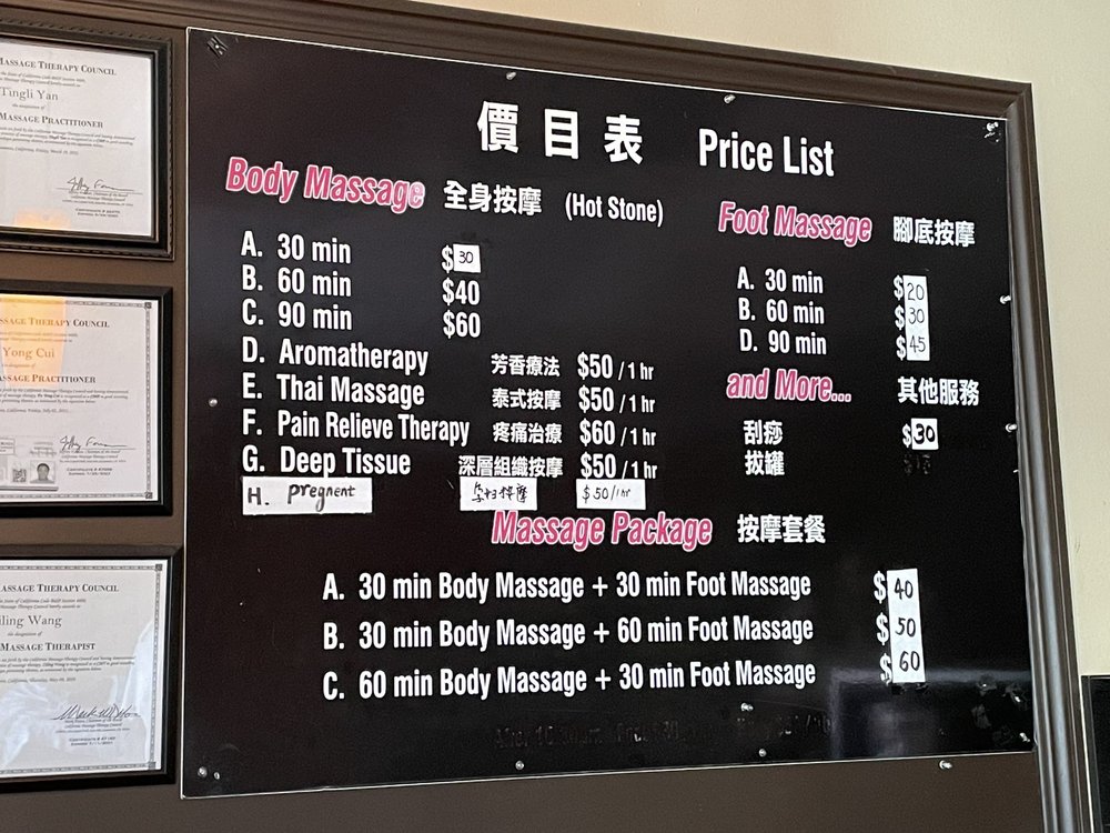 This is my go-to massage place after trying several in the SGV area. Lina is very thorough and the pressure was consistent throughout the 60 minute massage, considering I requested "hard". My boyfriend enjoyed his massage with Jason as well. He definitely kneaded the knots on shoulders and lower back. Prices are reasonable and the area is very clean. Ample street parking or the empty lot across the street.