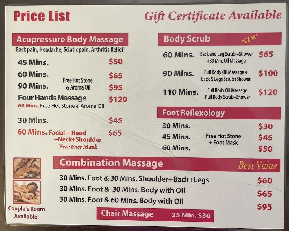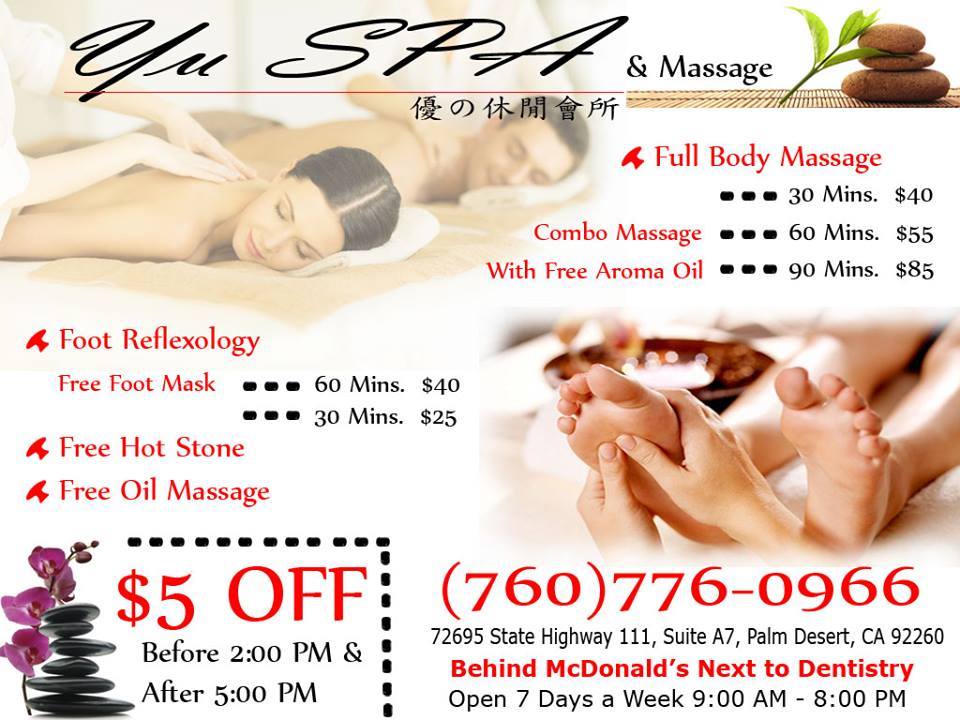 I am visiting the area for work and came upon Yu Spa and I decided to try it out. I booked the 2-hour full body scrub + massage and it was absolutely wonderful and so relaxing. Started with a body scrub, it was lovely and made my skin super soft. The massage therapist was very thorough and worked out all my knots. The hot stones were great too. I would definitely recommend and will be coming back next time I’m in town.