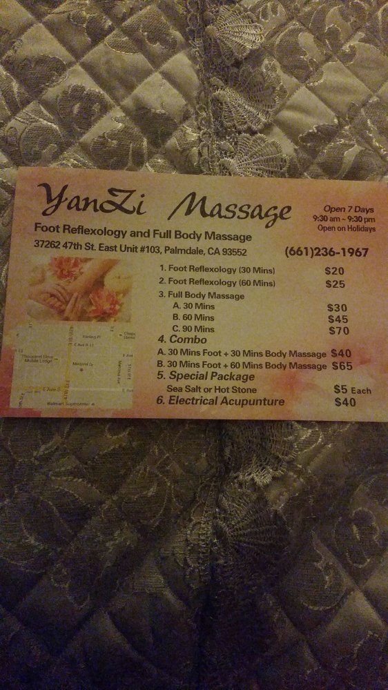 The best massage parlor I've ever been to in Palmdale/Lancaster. My friend and I called on the fly and were able to get accommodated for 2 massages, both were the combo (30 min foot massage + 30 min body massage). The ladies that took care of us were Tina and May. The quality of the massages were absolutely outstanding. The prices of the massages were also very reasonable and affordable. I'll gladly be tipping $20 every time to experience massage sessions like the ones we had tonight. We'll be returning soon!