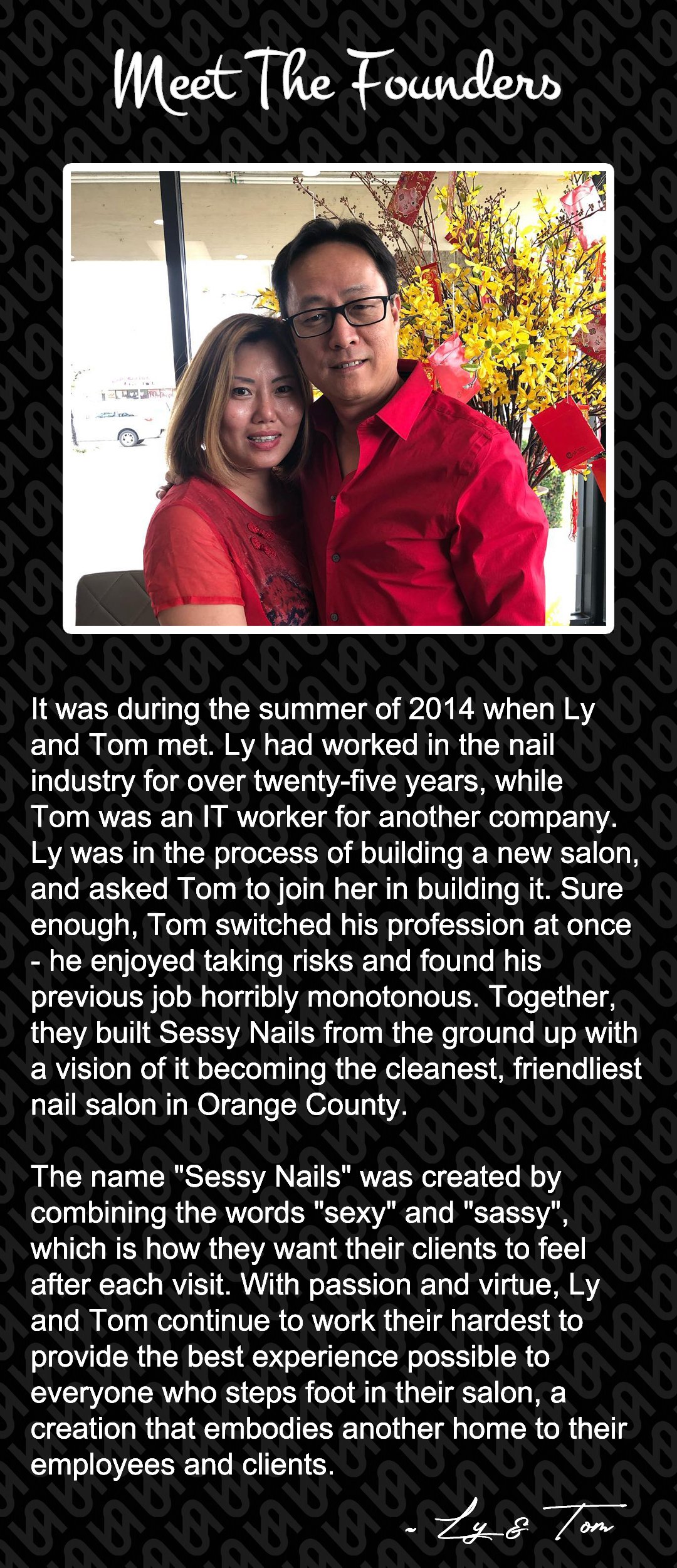 Hands down the best nail salon. Tom and Ly are great. The nail salon is one the cleanest I have been to and so many colors to choose from. Always accommodating when it comes to my crazy nail design ideas.
