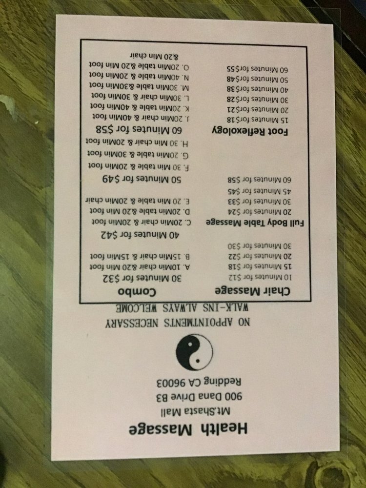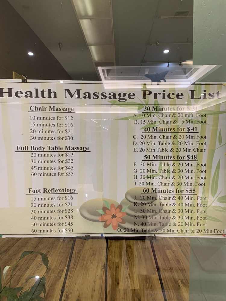 The best massage I've ever had! I had several types of massage and some were bad some excellent...this one was to the superlative degree. I do not know the woman's name who performed the 40 min. table massage and 20 min. foot massage, but she was the BEST. Although we didn't talk, she knew exactly what needed the most work! I will definitely return again and again! Very clean, quiet, and professional.