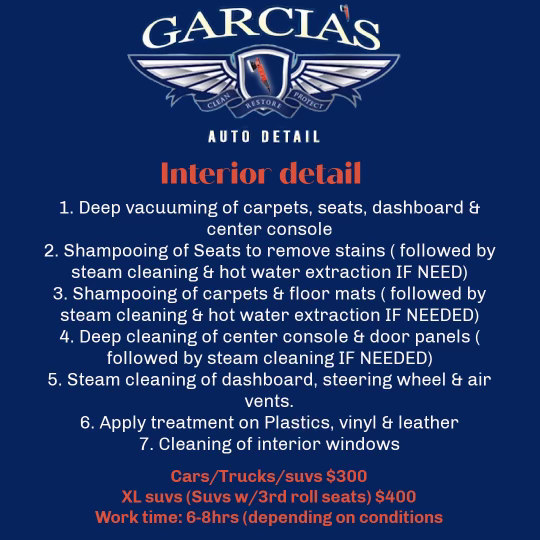 Garcia’s Auto Detailing did an amazing job!!! He came to our office in Riverside and worked on two of our cars. Both came out looking great; exterior and interior. He will be our go to guy now!