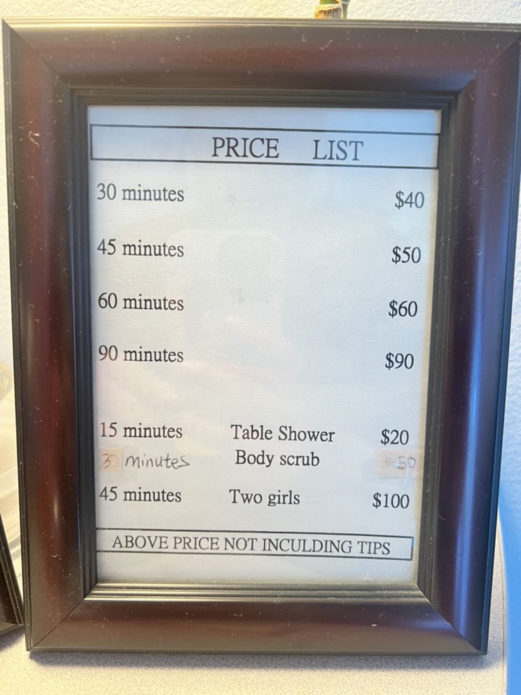 Place is clean, therapist was nice. But the rest was downhill to me. The massage table was very hard - not comfortable unless you're flat chested. The massage was just OK. I asked for medium pressure she was very firm. I had to ask for less pressure. Also no lotion used the first 10 mins, I had to ask for lotion then only a small amount was used at times/ not consistent through the massage. $60/hr plus $15 tip. Head and foot massage felt nice, Unfortunately it just didn't feel great on the rest of my body.