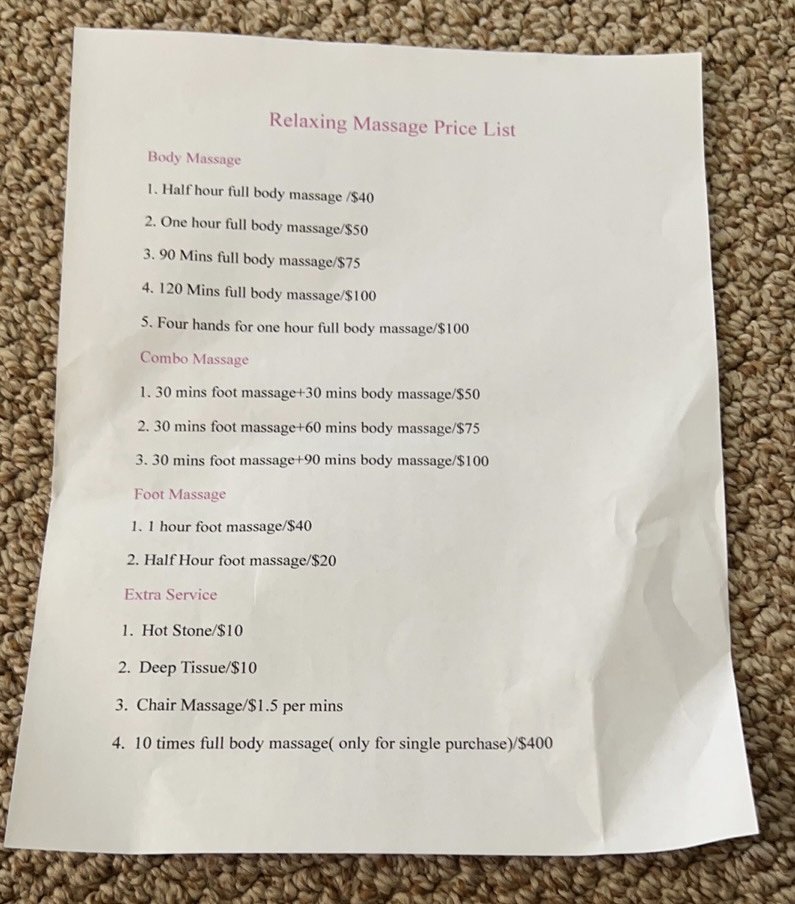 The front lady was very nice, this was my first time here, and she really tried her best to explain everything for me. I got a 60 mins massage, it was a really good experience, focused exactly where I requested which were my shoulders, neck and calves. I will definitely be going back!