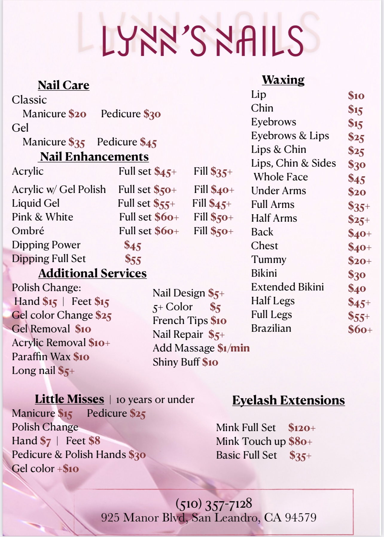I’ve been coming to Lynn’s nail salon frequently now. They are so good and provide high quality nails. They’ll ask if you like your nails during the process. I usually go to Sandra or Ally for my nails. They are the best and give me advice on what looks good too. I highly recommend checking them out. You can call and make an appointment or walk in.