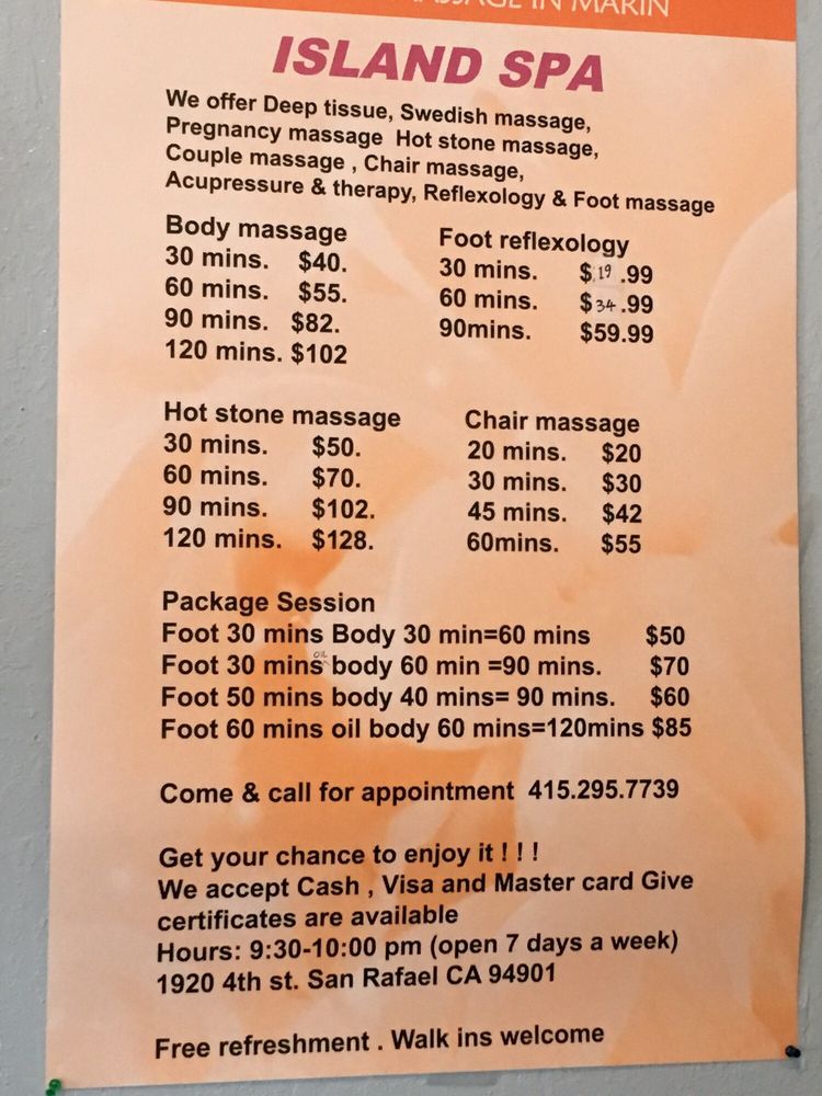 Always come out feeling relaxed, rejuvenated and grounded. The team is professional they all have excellent skills to release tension and knots. I highly encourage you to experience Island Spa!