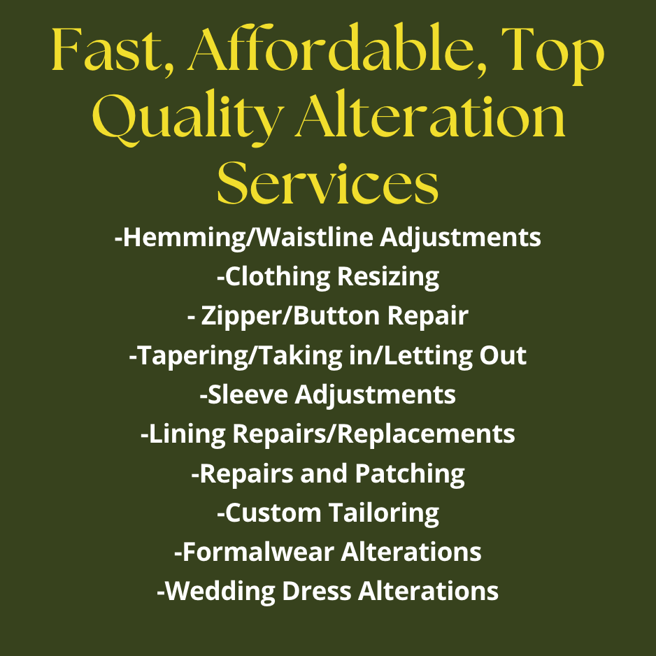 I was very impressed with how detail oriented my alterations were completed. The seamstress exceeded my expectations but hemming martial arts uniforms using the exact same complicated stitching that existed prior to the alteration. I had not requested she do so but she did regardless which was a nice surprise. She also redesigned on aspect of my Gi uniform making it better than before. I highly recommend this business.