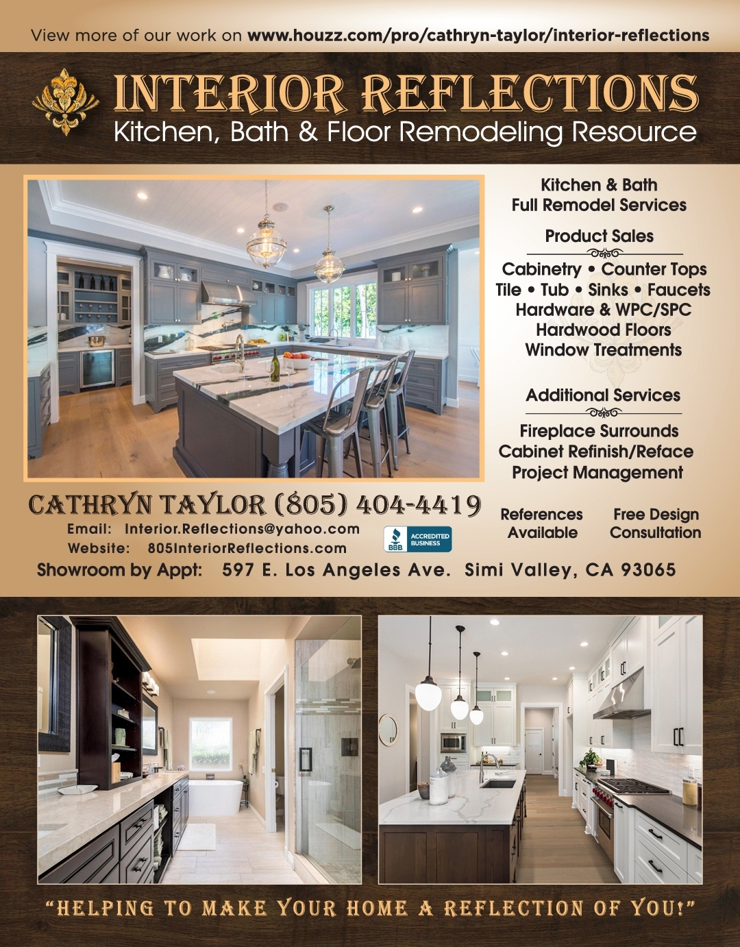 We used Interior Reflections to replace and install new cabinets, flooring, shower and paint throughout our home as well as some plumbing and electrical updates. we were so pleased with the work quality and professionalism of Cathryn and her crew. Everyone was very courteous and took care of our home like it was theirs. I would highly recommend them for any remodeling projects.