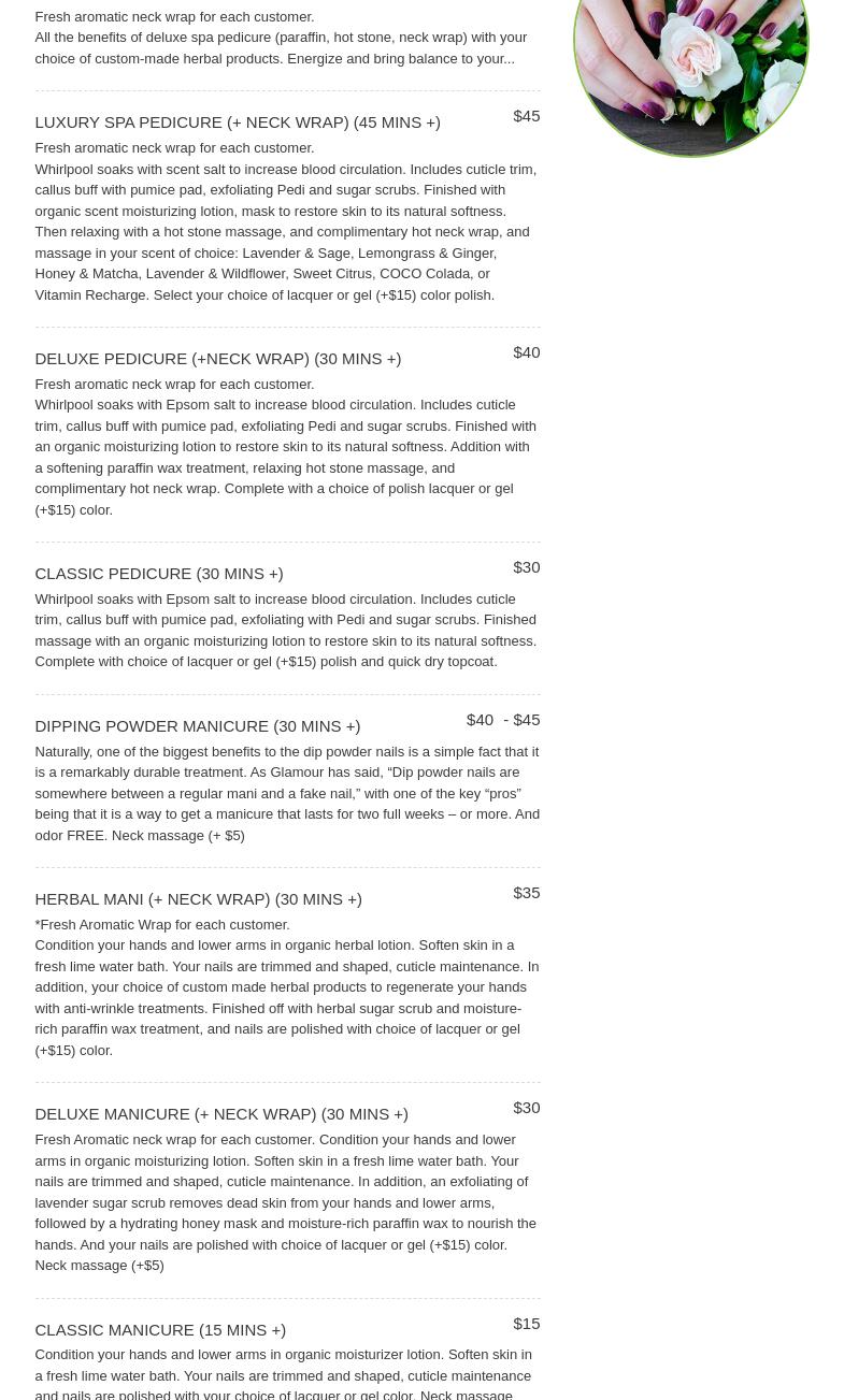 I received a deluxe pedicure. Service was top notch! The hot stone massage & hot towels on BOTH legs and feet felt amazing I almost fell asleep. She used lavender sugar scrub & lotion that smells good. I was very relaxed with the neck heating pad & massage chair. She took her time and was very thorough. My gel polish looks beautiful and I’m very satisfied. I will definitely be coming back. The price was great too compared to other nail salons and who doesn’t have hot stones and or rush the massage. I highly recommend this place. :-) 5 ⭐️ !