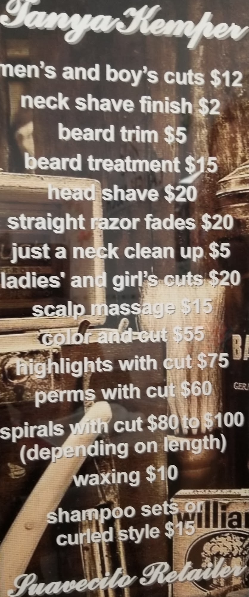 Tanya had really helped fix my hair cut. Thank you oh so much and its priced just right! And men let me tell you the shave is as smooth as a baby's butt! She does such a great job. Ladies if you suffer from tension headaches or even migraines hello!!!! Go see Tanya for a scalp massage! ITS TOTALLY WORTH IT!