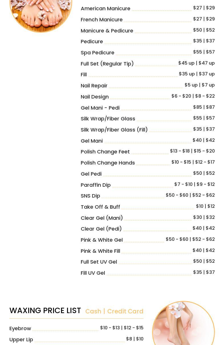 ProsWe are able to immediately walk inThe manicurist was extremely professional and did a great jobShe got all the callus off without using the cheese scraper or bladeConsThe end interaction was weird they wouldnt take the tip on the card ans then talkes about usThey dont have a wide variety of spa pedicure servicesDont offer hot stone massage