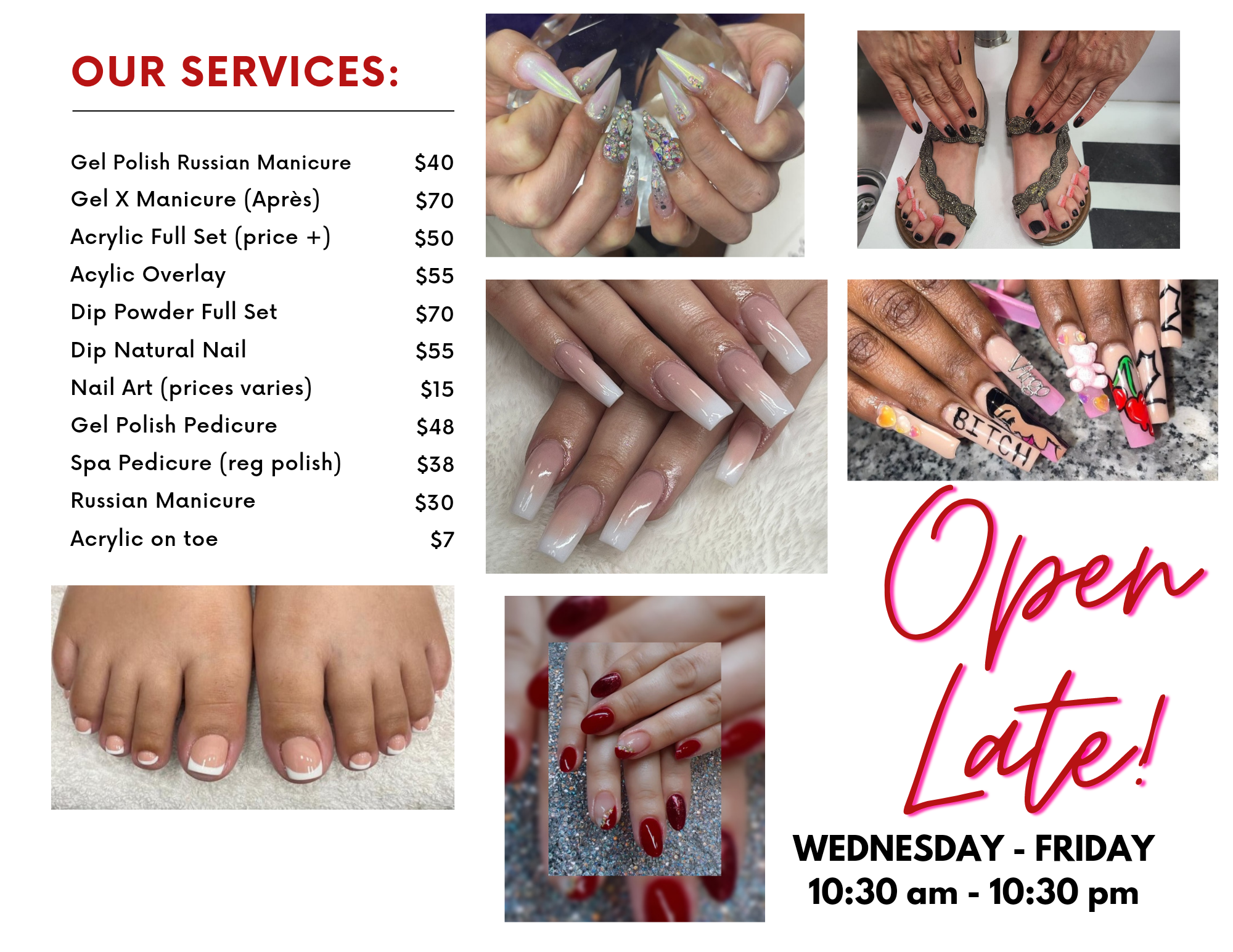 I did an acrylic fill and am super happy with the attention to detail. The whole staff are so sweet and kind. Definately recommend this place to do your nails any style! I was able to get a last minute appointment straight from the airport.