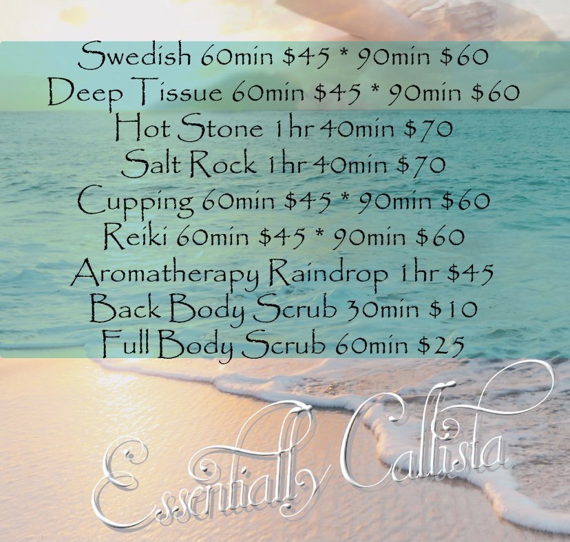Essentially Callista is owned by Callista, the masseuse in question. (Go local business!) I found she listens well to whatever I'm having trouble with (I'm prone to lower back pain), and her prices are reasonable. Definitely recommend. While she takes walk ins, it's a good idea to check her availability, since she can book up quickly, especially on weekends.