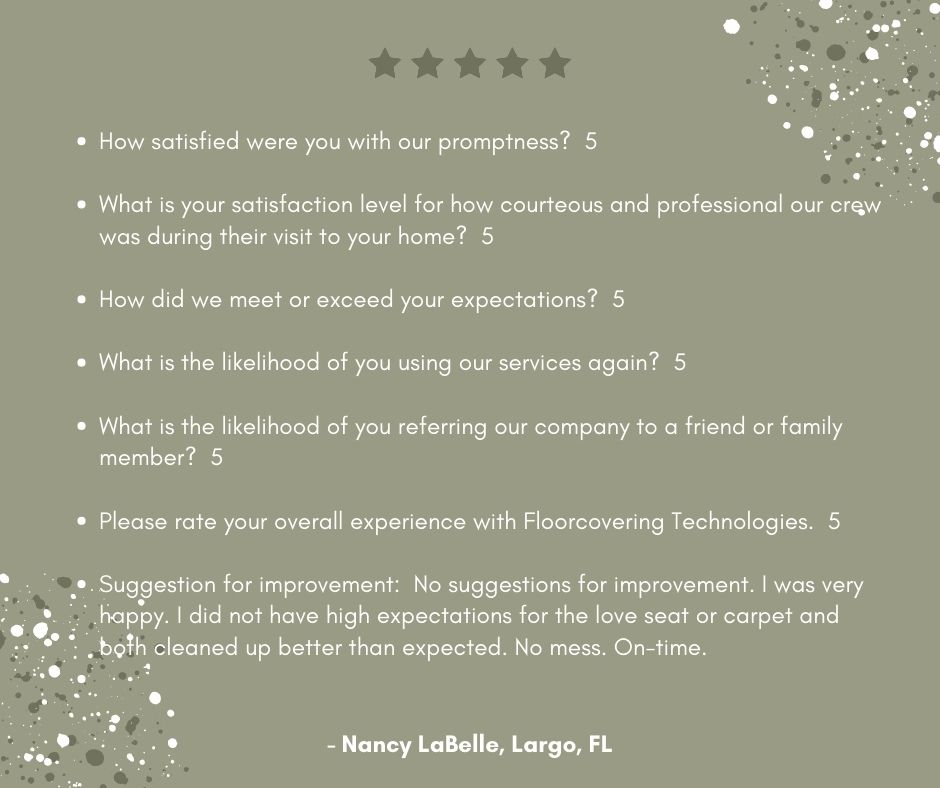 Jerry and his crew are top-notch! He arrived right on time and his whole process is very efficient. I showed him an old gum stain on our carpet from the kids and when he was done it was 100% gone like it was never there! I highly recommend Jerry because of his skills, professionalism and reasonable price. You're not going to find a better company out there for your flooring and upholstery cleaning needs. Thank you for your hard work Jerry. Travis and Annette