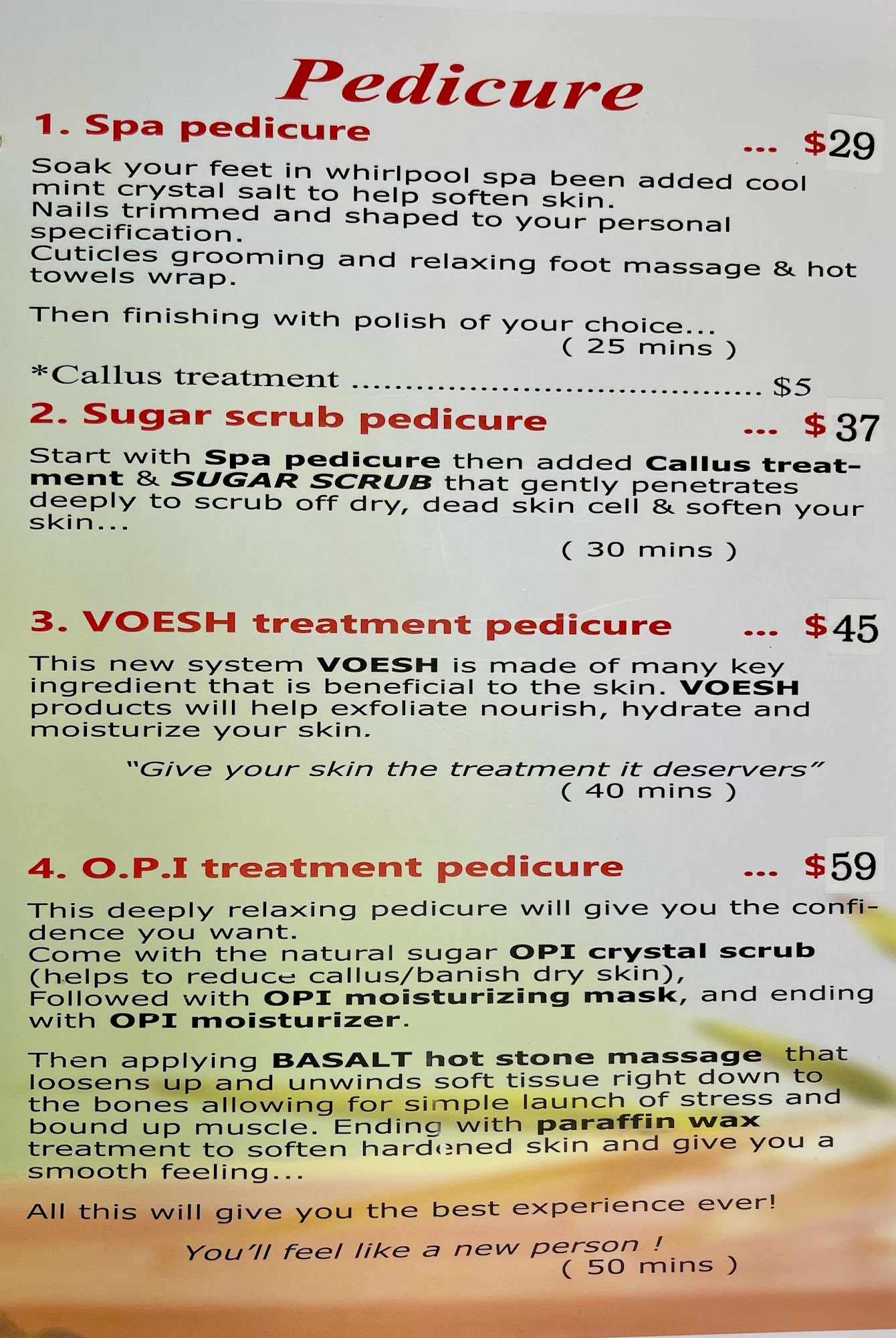 They had great service but this is my experience: I sat down and this lady started doing my nails (obvi) i was supposed to have cheetah print on my nails and they started putting white french tips?? I asked her what she was doing and she said they didn’t have the color. I said okay but i saw a color very very similar to it with the lady beside me. the inspiration pic is in the photos and i asked for blue instead of red. i’m not mad but it kinda looks like cow print…