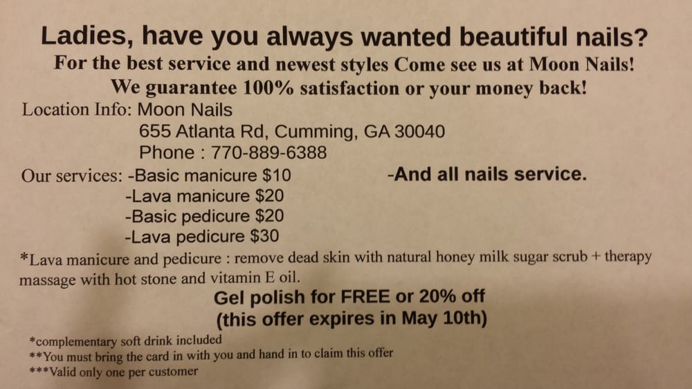 Tonight, I walked in and found a very polite staff. I am a teacher and have been waiting to get a pedicure for awhile now. I stopped by last minute and Moon Nails made time for me. It was a quiet and relaxing atmosphere. All of the staff were honest and kind. I will definitely be coming back again! Thank you all so much:)Service: Pedicures