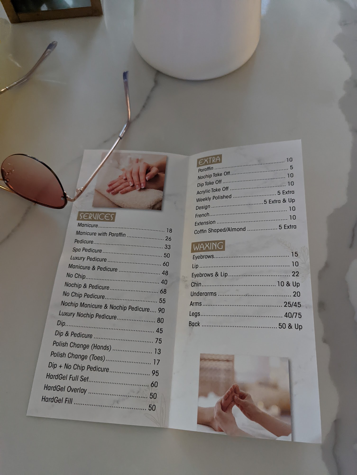 Great experience & nice workers. They also give you a punch card so after 10 services you get a free pedicure. I wish they had more dip color options but other than that I like it.