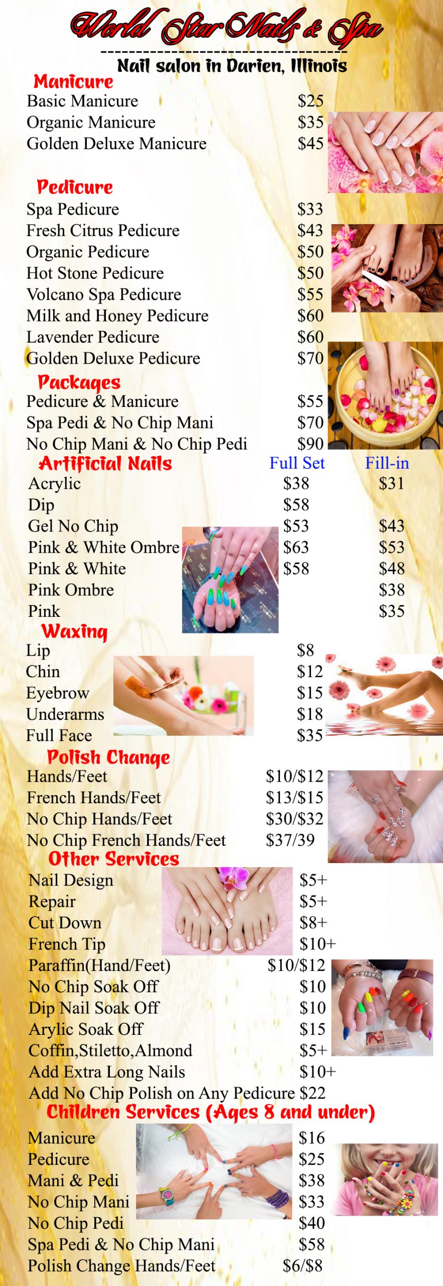 World star Nails and spa is AMAZING!!!!! I came in and was greeted with a beautiful space and good service! I had a reference photo and he did an amazing job!!! I came in with in 50 minutes of closing and they took me in, and worked on them even after working hours!!!!