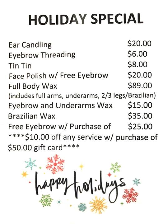 My husband surprised me and bought me a wax day it was whole body: Brazilian, half legs, half arms, under arms. The woman who did mine was HORRIBLE!!!! DONT GO THERE FOR A BRAZILIAN!!! She left soooooo much hair on the inside it’s crazy and I asked her about it and she said she can’t get it if she pulls too many times it’s a liability. I said I understand but if you can’t do Brazilians properly you shouldn’t offer those services. I get Brazilian because I want NO HAIR AT ALL!!!! I shouldn’t have to pluck or shave or go somewhere else because she didn’t do it properly. I said I get waxed often and never had this problem. Also she uses soft wax for Brazilian... read full review