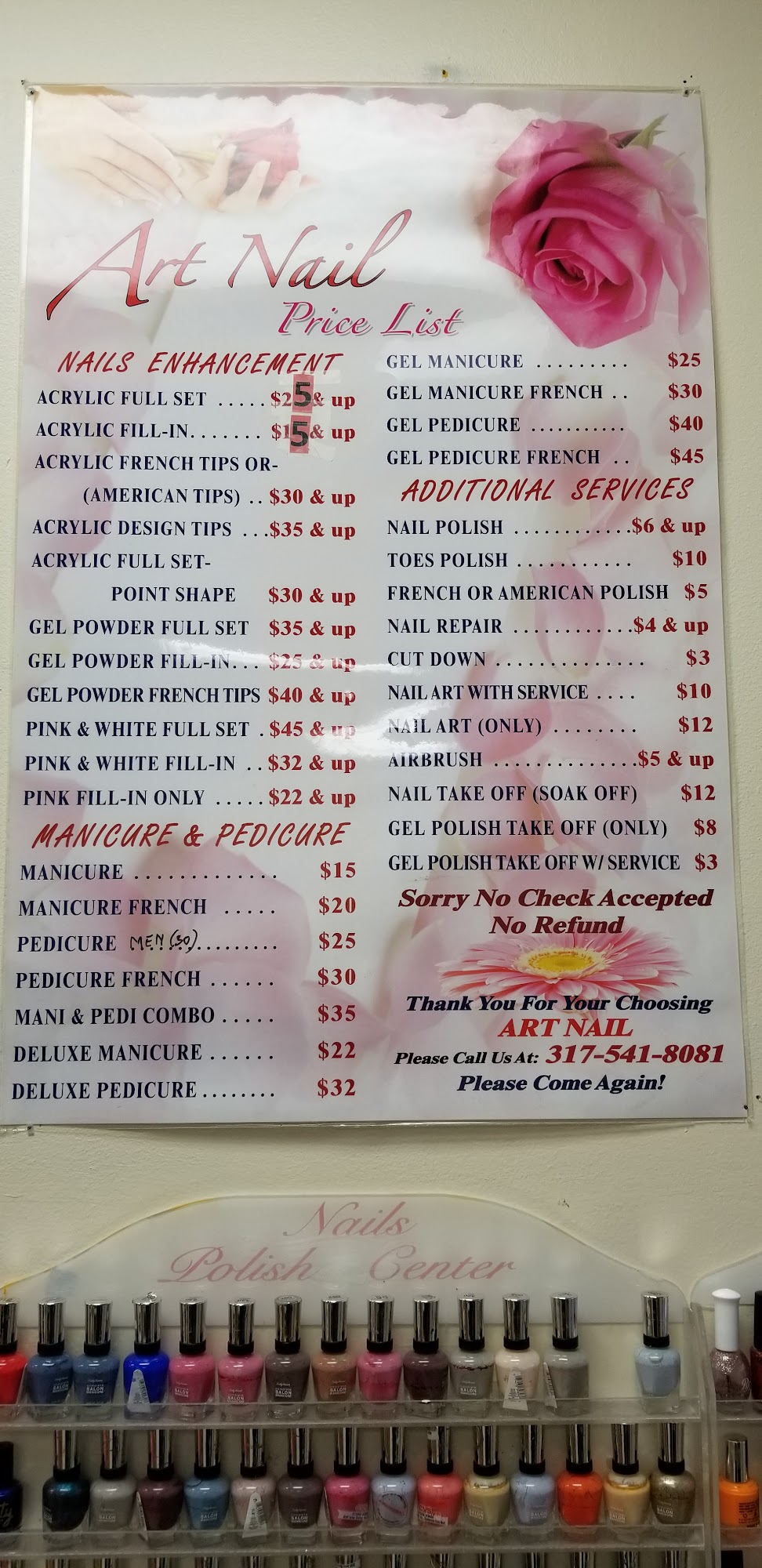 I had to go here tonight due to my usual place not having time to fit me in & at first I was a bit sketched out because of the area but the man who was in there tonight was VERY nice. He even walked me out to my car due to me staying after hours since he was the only one working tonight. He shaped my nails better then what they were before and the end results were very much what i expected and was wanting! Definitely walked out 10/10 impressed! & very affordable prices as well!!Service: Acrylic nails