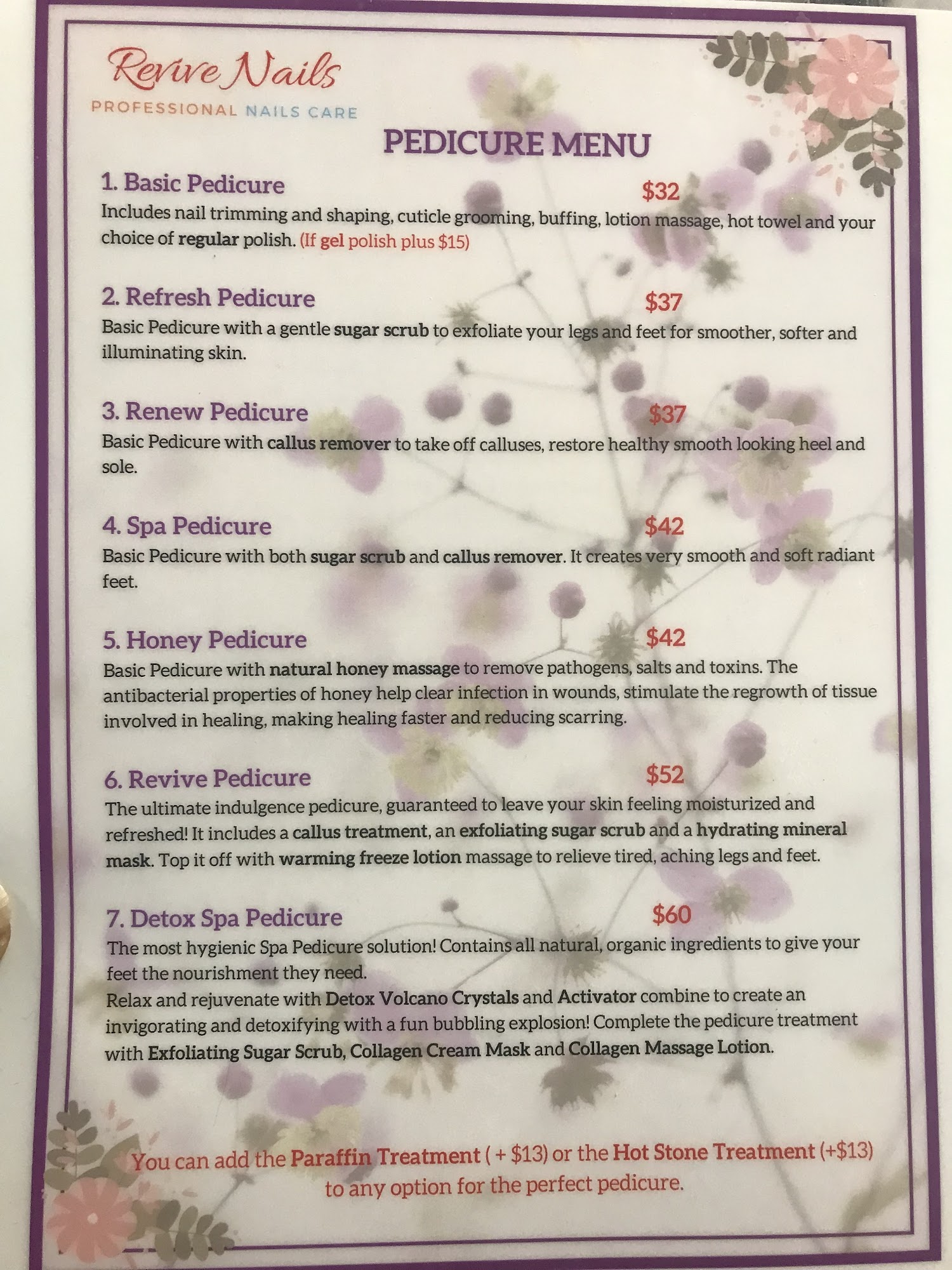 I absolutely love Revive! They actually talk to you, will hold a conversation! The staff is friendly and genuinely care about consumer satisfaction!I recommend Revive to a friend and she has been going ever since!I highly recommend them to anyone looking for excellent mani/pedi’s and friendly service mail tech?